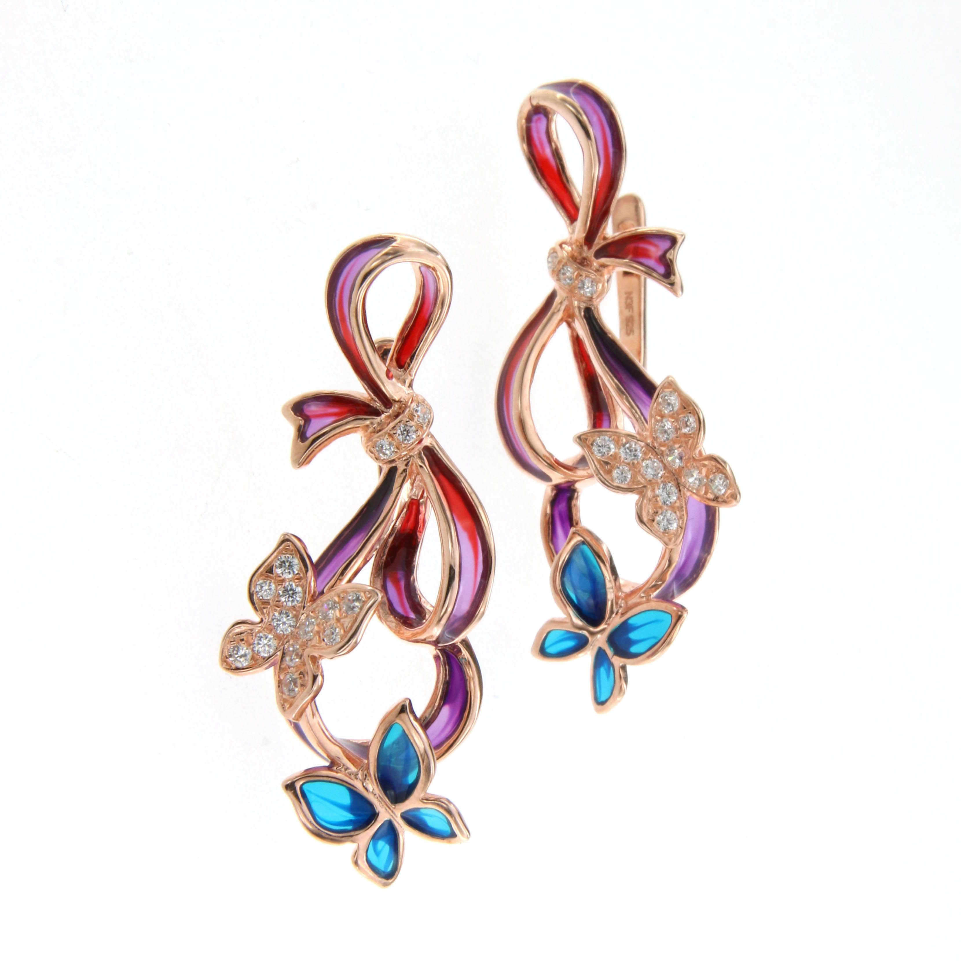 Обеци от "Jacklin hugasian" в розово сребро с цветен емайл и циркони. Колекция "Roberto Bravo".