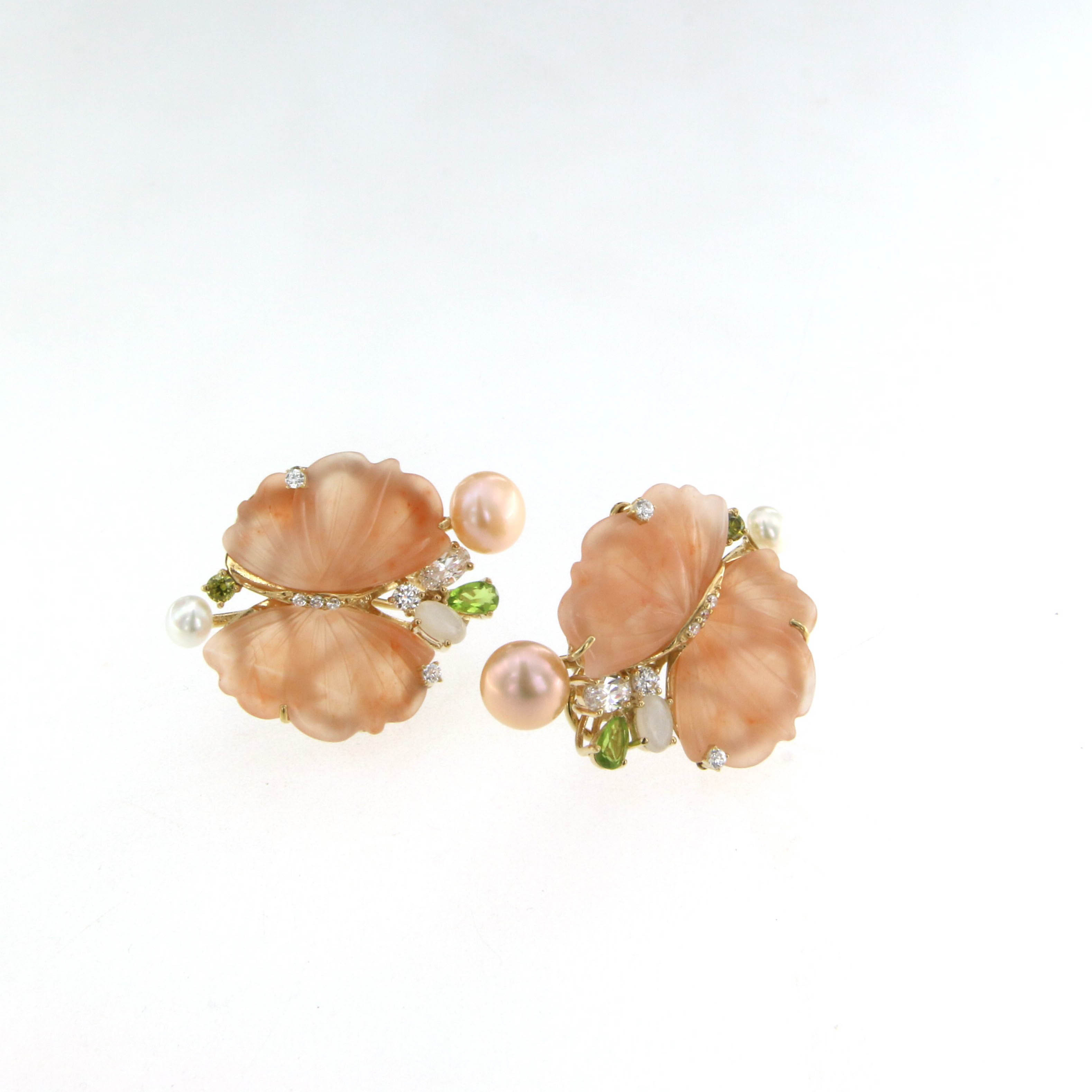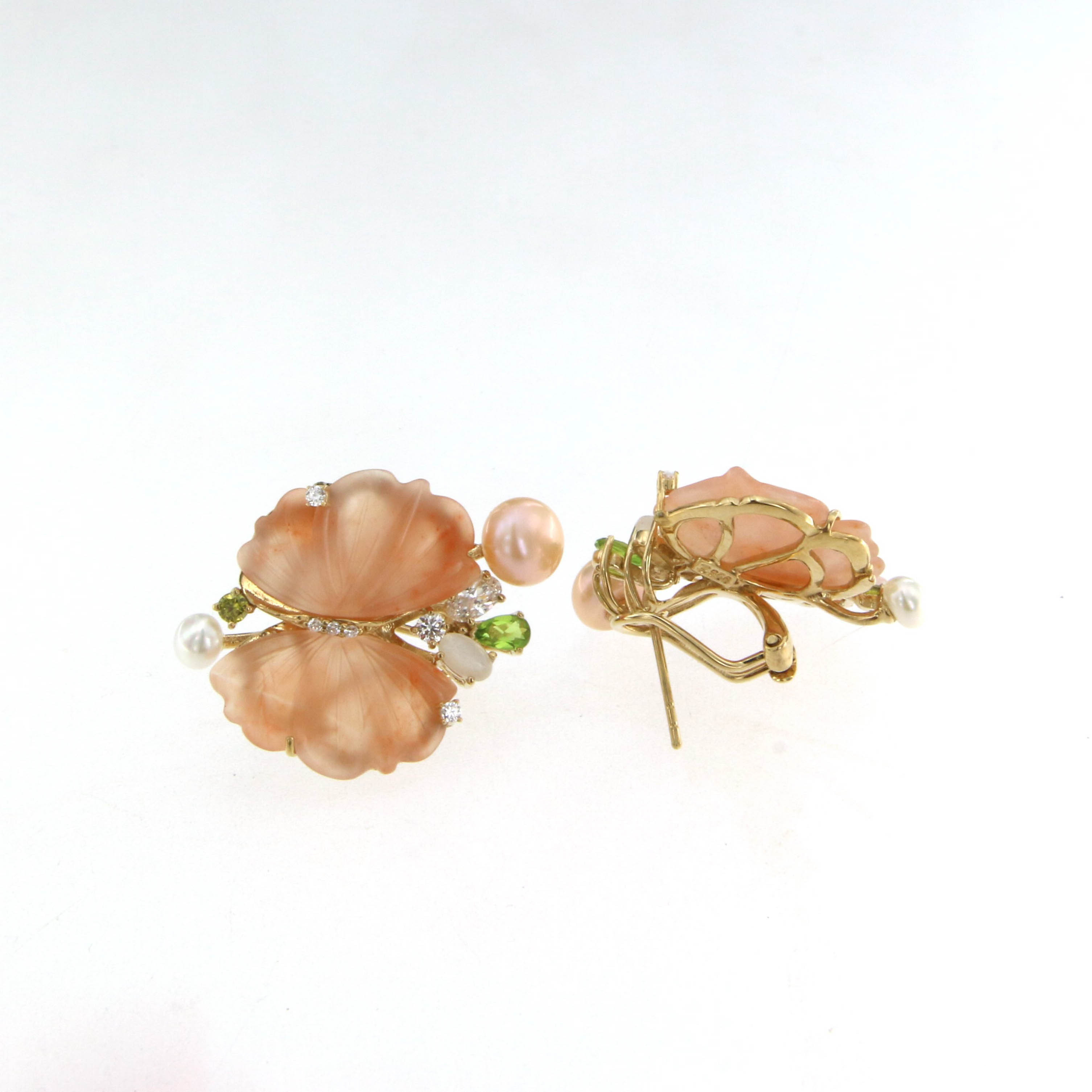 Обеци от “Jacklin hugasian” в сребро с позлата, корал, естествена перла, перидот, ахат и цирконии. Дължина 3 см, широчина 2,5 см.