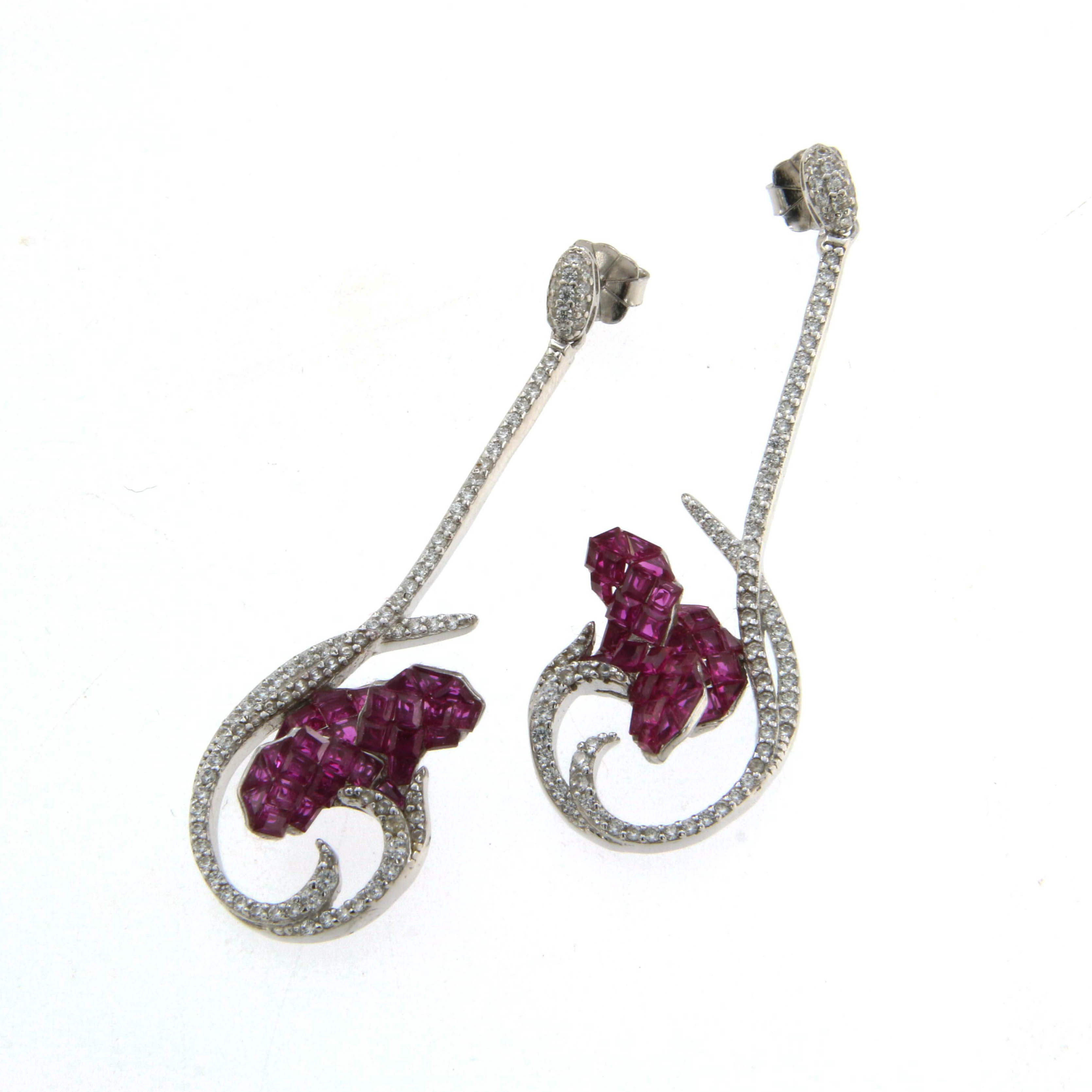 Обеци от “Jacklin hugasian” в сребро с циркони и рубин. Дължина 4,5 см. , широчина 1.5 см.