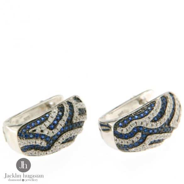 Обеци от "Jacklin hugasian" в сребро със сапфир и цирконии. Широчина 1.0 см, дължина 1.4 см.
