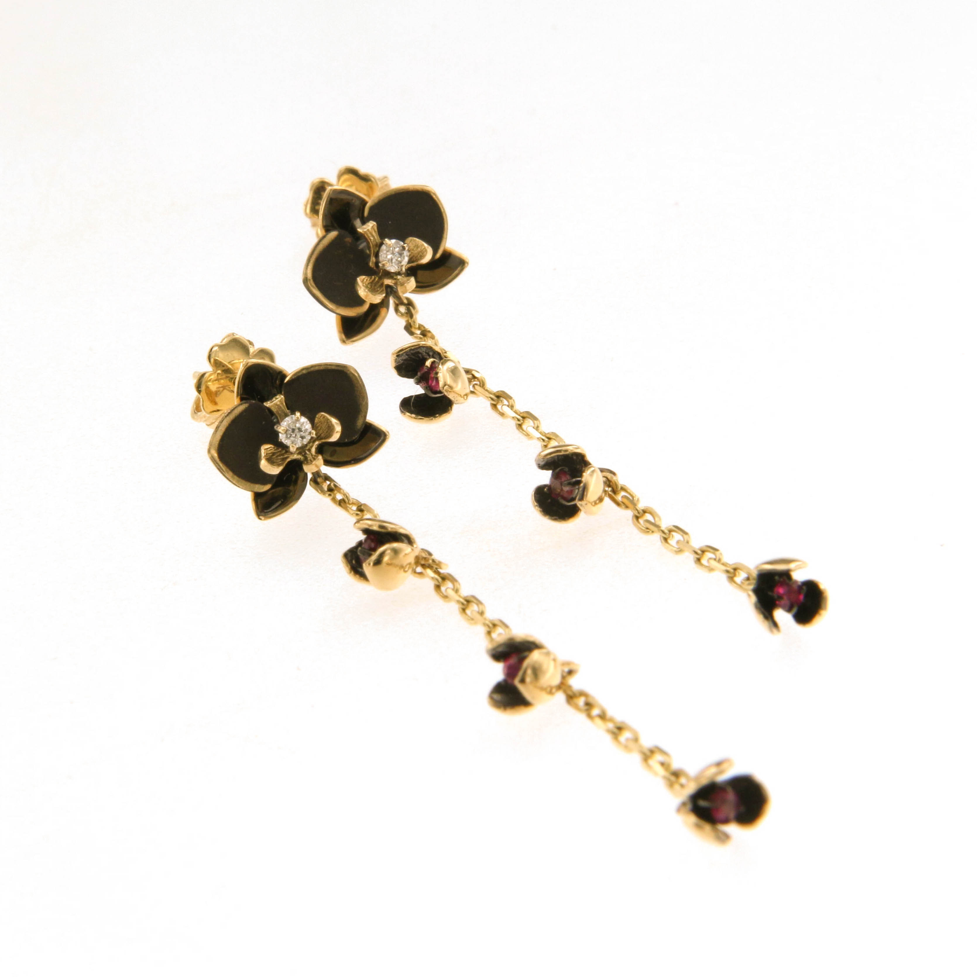 Oбеци от "Jacklin hugasian" в жълто и оксидирано злато с диамант, рубин и черен емайл.