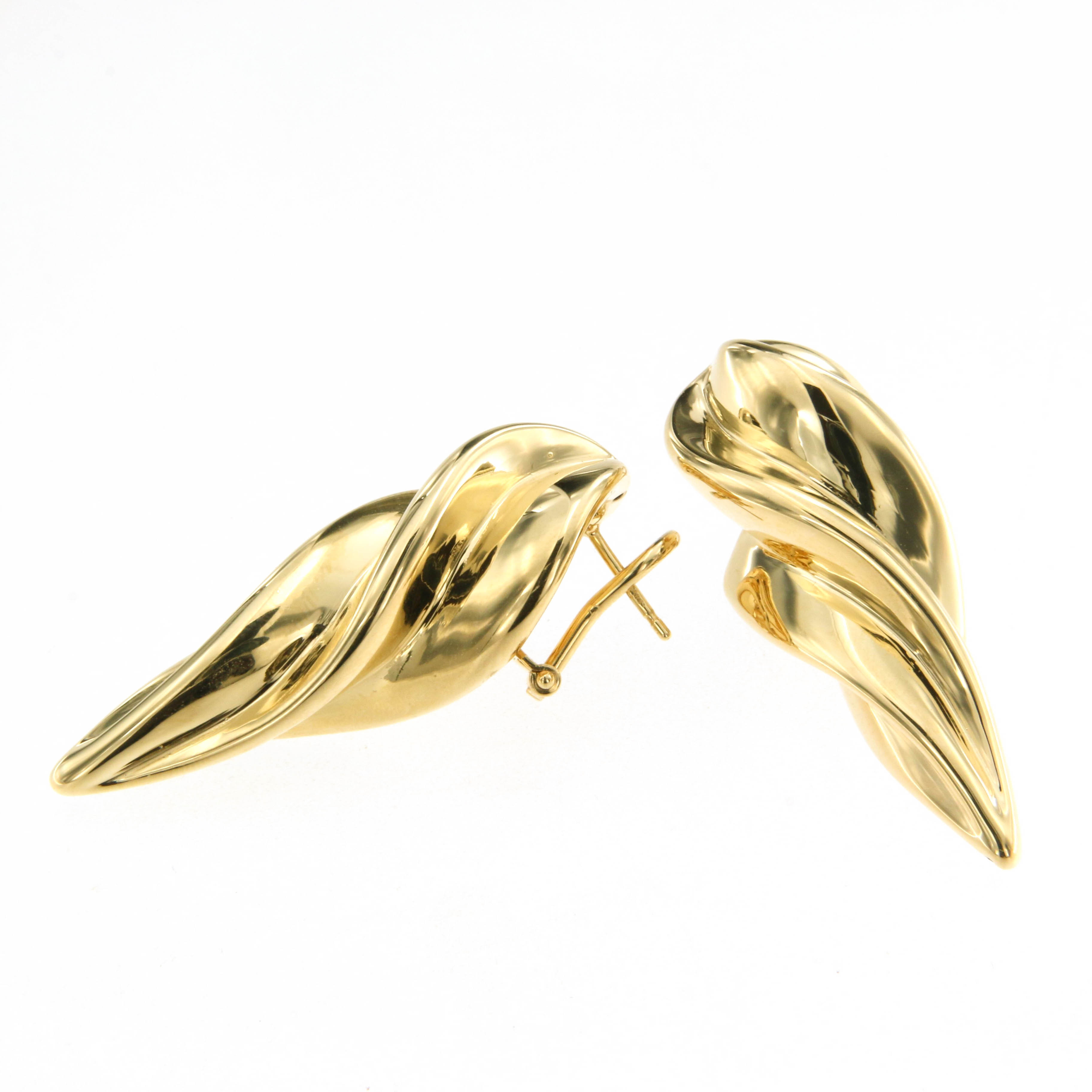 Обеци от “Jacklin hugasian” в жълто  злато гланц.  Дължина 4.0 см., широчина 1.5 см. Колекция “Fiore D’oro”. Произход Италия.
