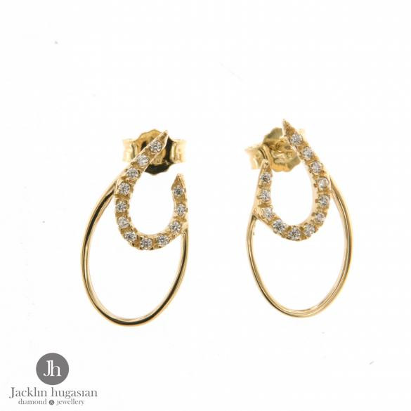 Обеци от " Jacklin hugasian " в жълто злато с цирконий,Дължина обеци 1.8 см., широчина 0.9 см.Произход Италия.