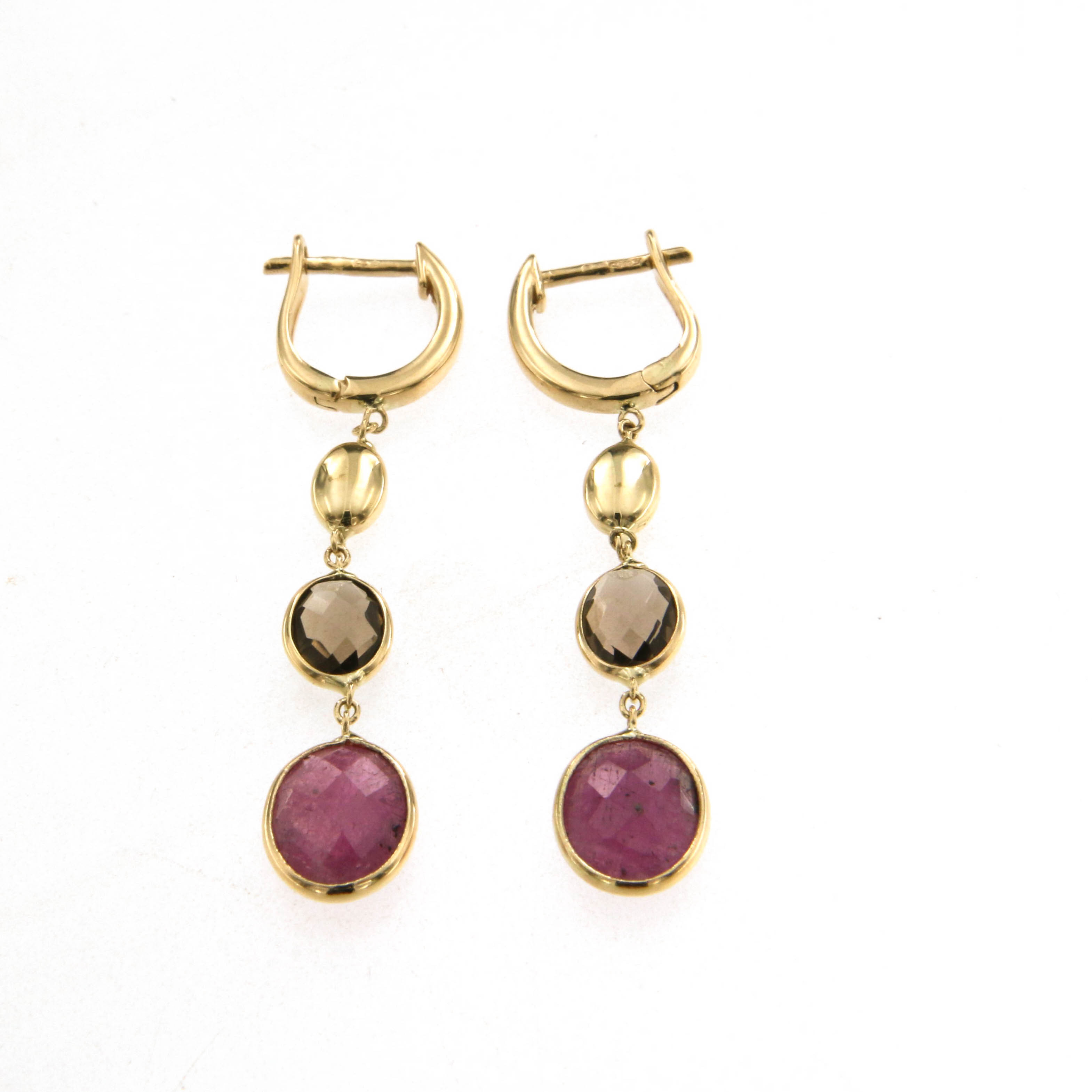 Обеци от “Jacklin hugasian” в жълто злато с опушен топаз и рубин. Дължина 4,5 см., широчина 0,5 см. Произход Италия