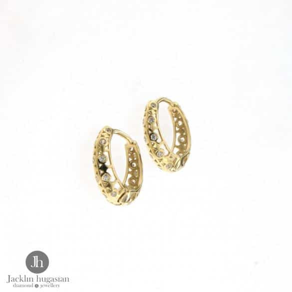 Обеци от " Jacklin hugasian " в жълто злато,гланц с цирконии