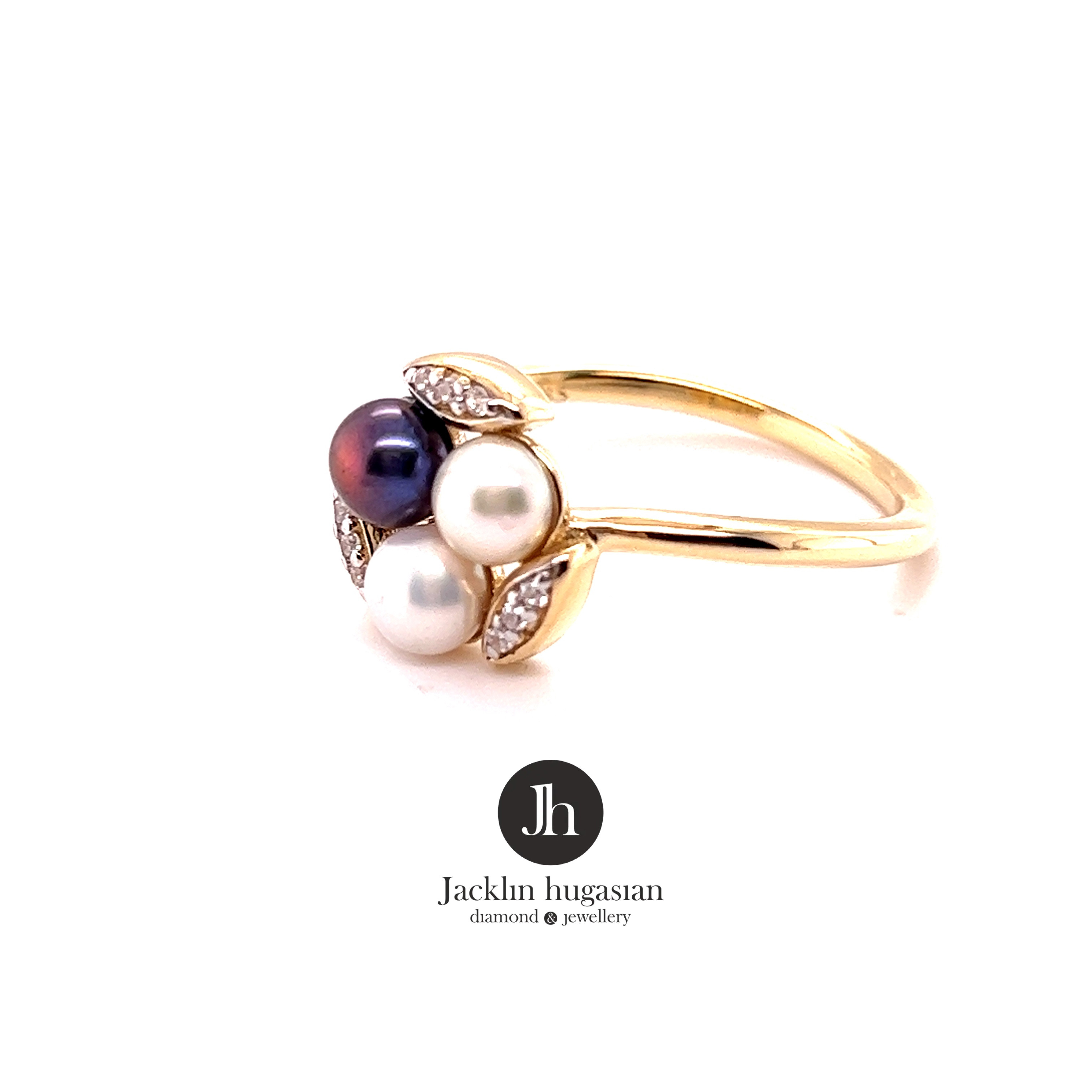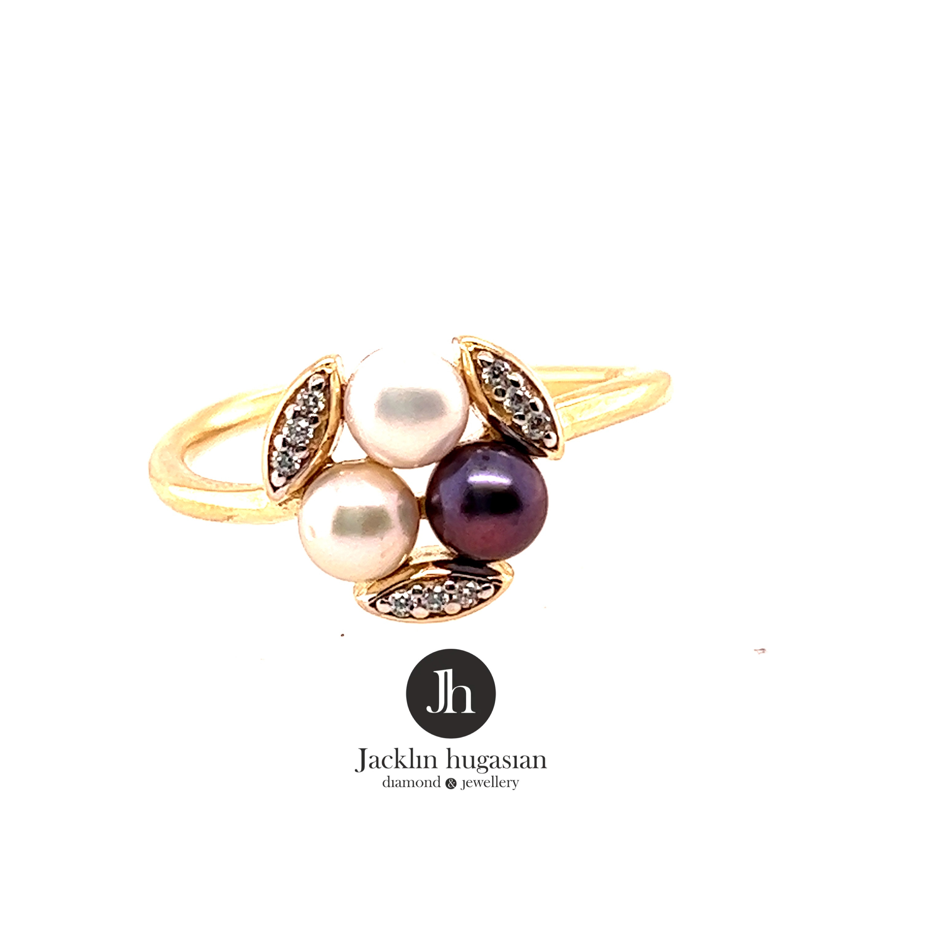 Пръстен от “Jacklin hugasian” в жълто злато с перли и циркони.