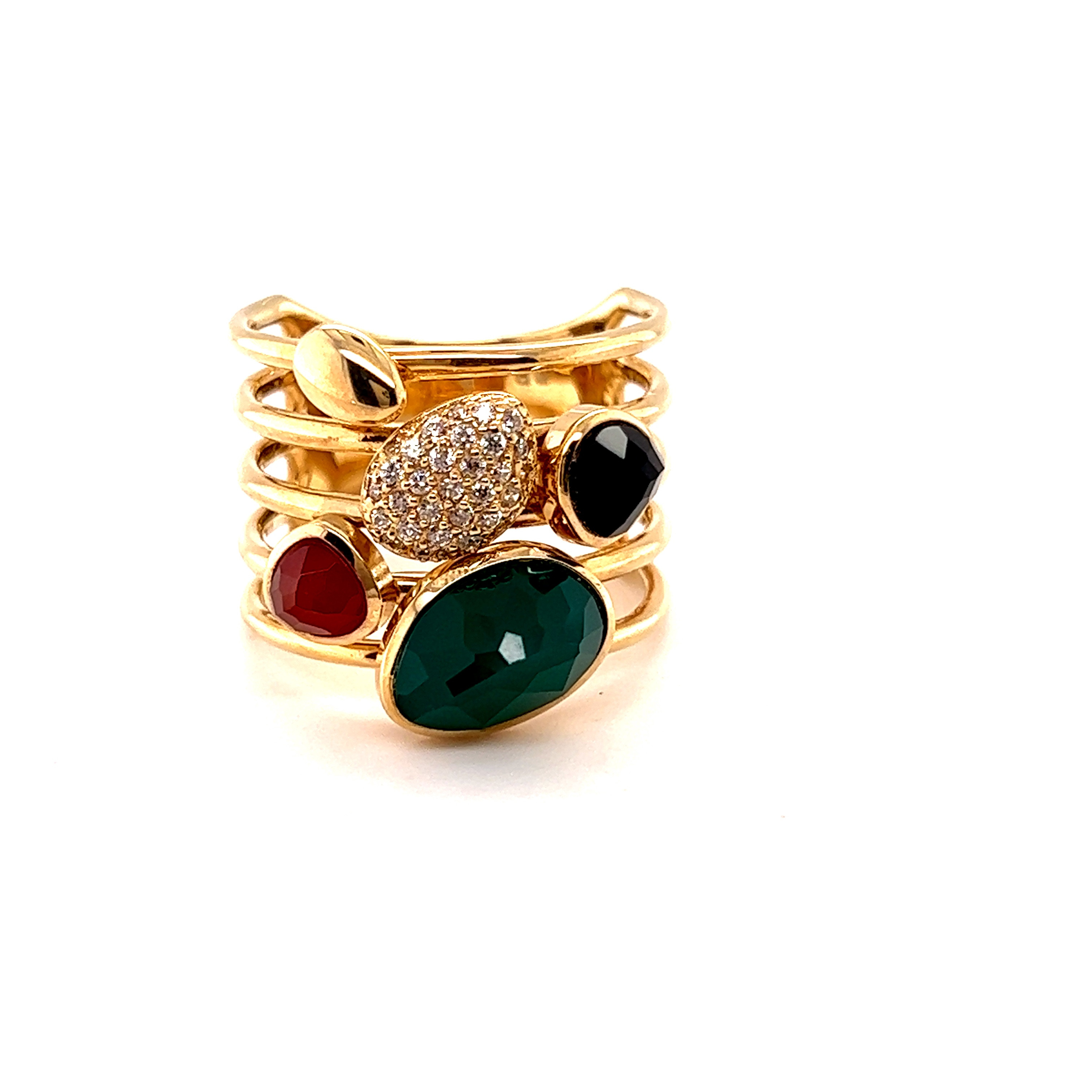 Пръстeн от “Jacklin hugasian” в жълто злато карнеол, оникс, нефрит и циркони.
