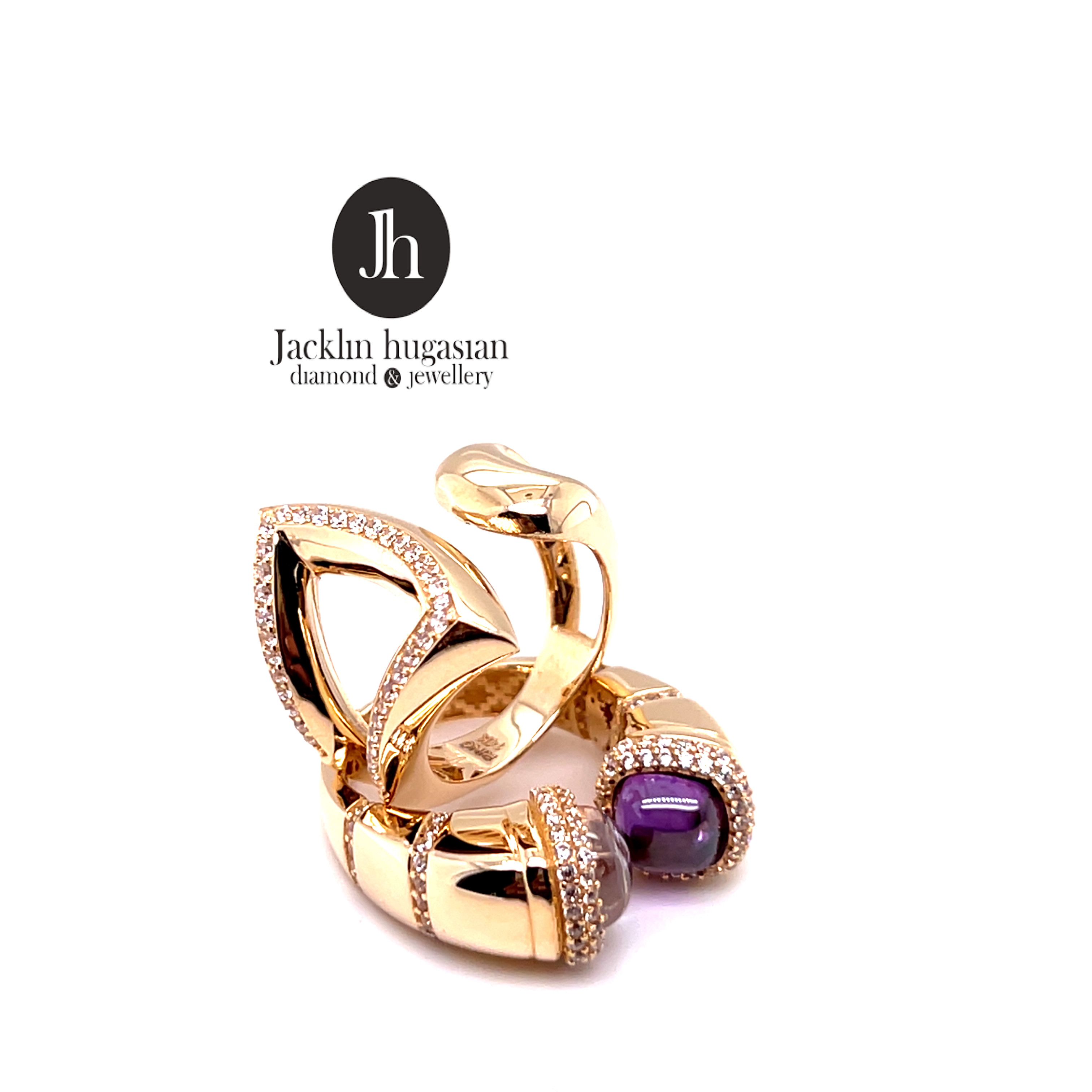 Пръстен от “Jacklin hugasian” в жълто злато гланц с аметист, розов кварц и циркони.