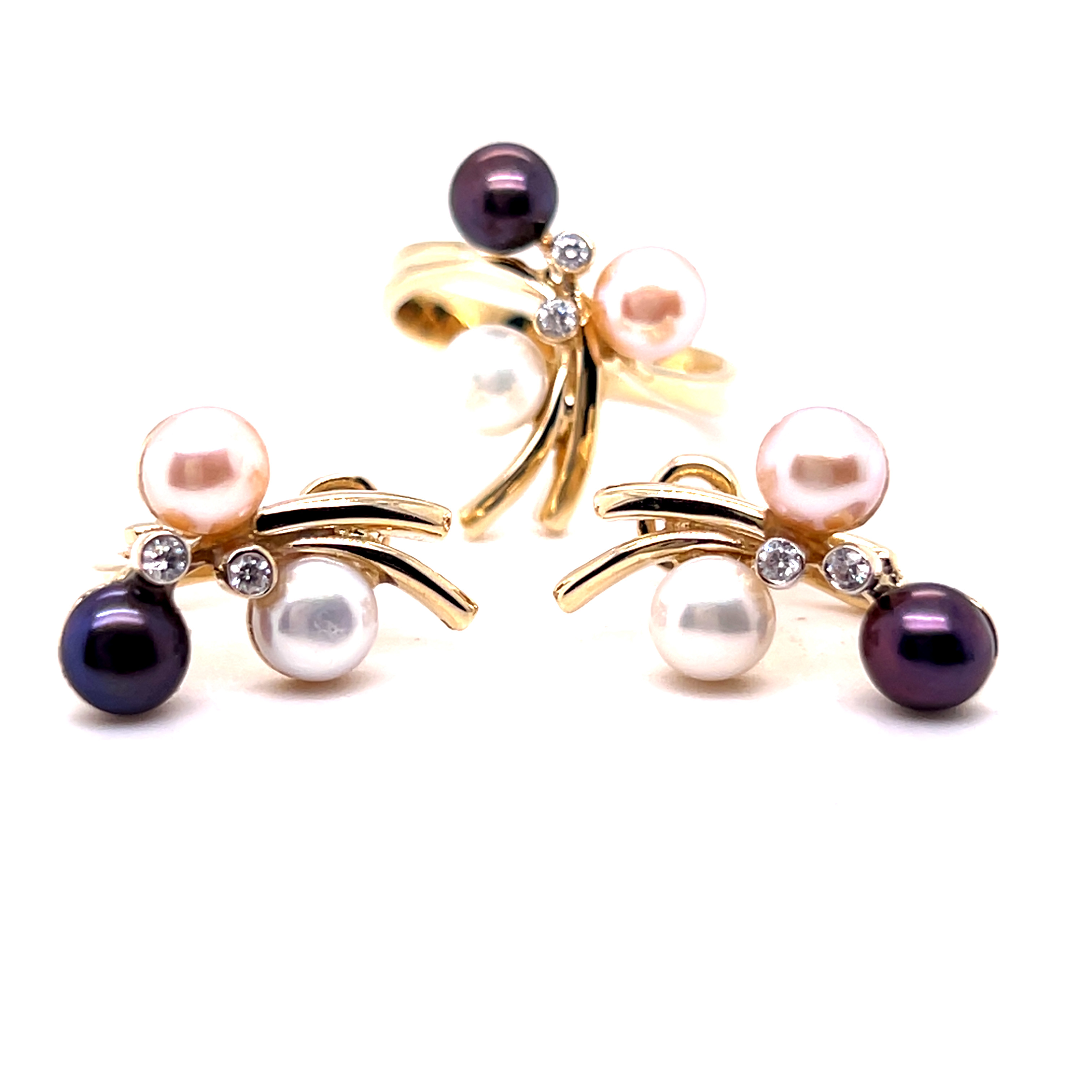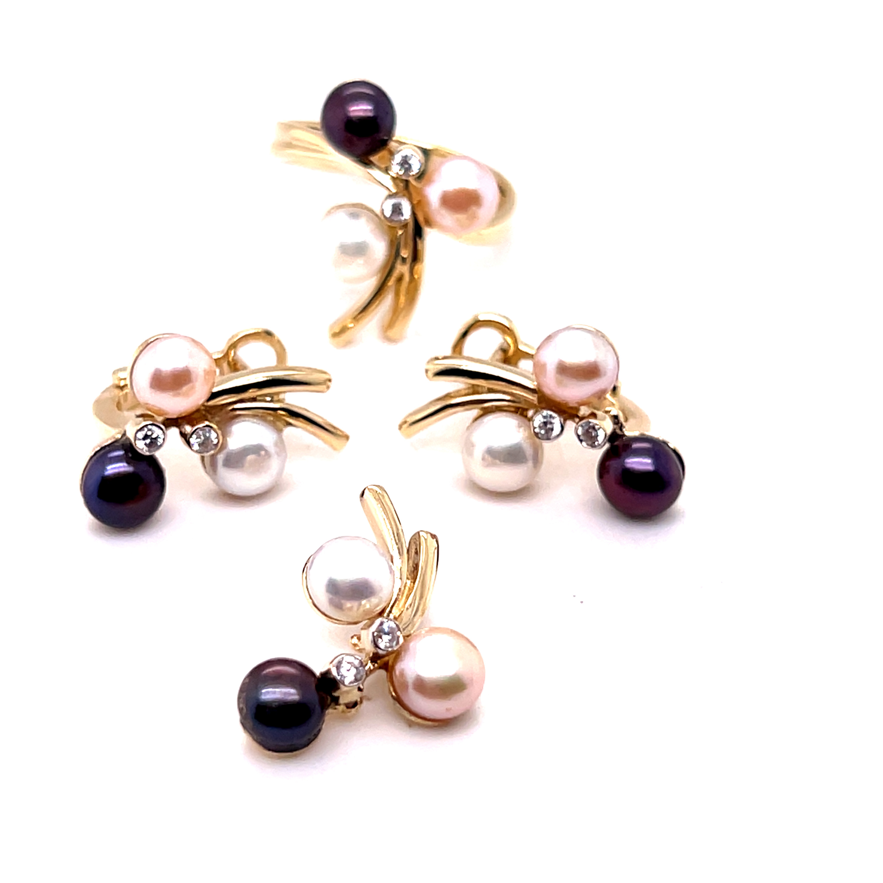 Комплект от “Jacklin hugasian” в жълто злато с бяла,розова и тъмна перла