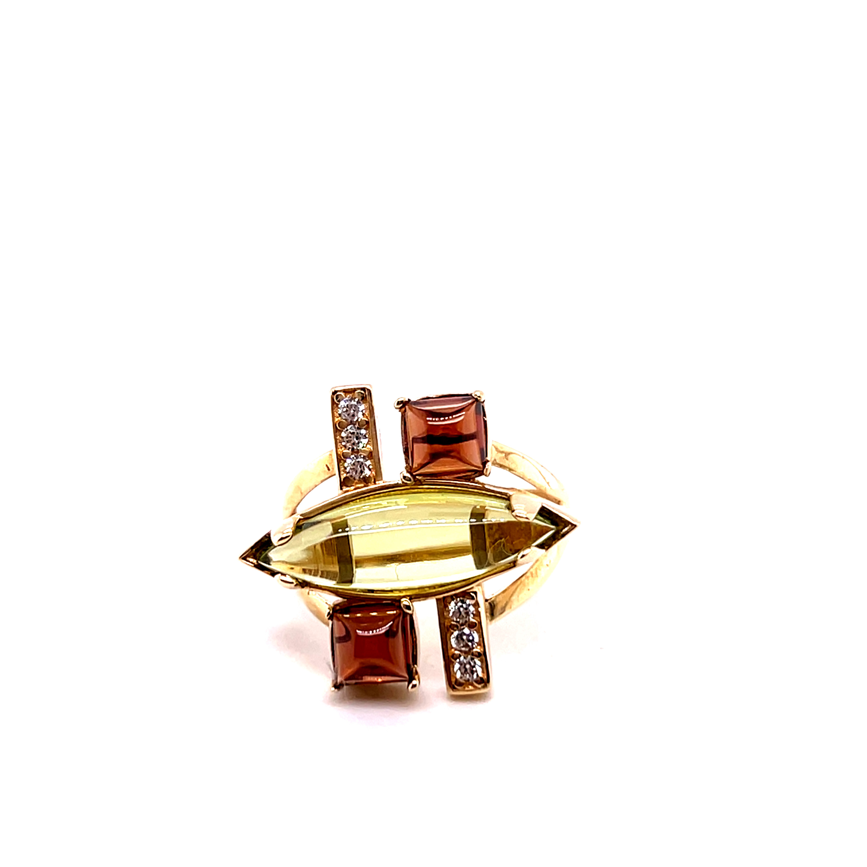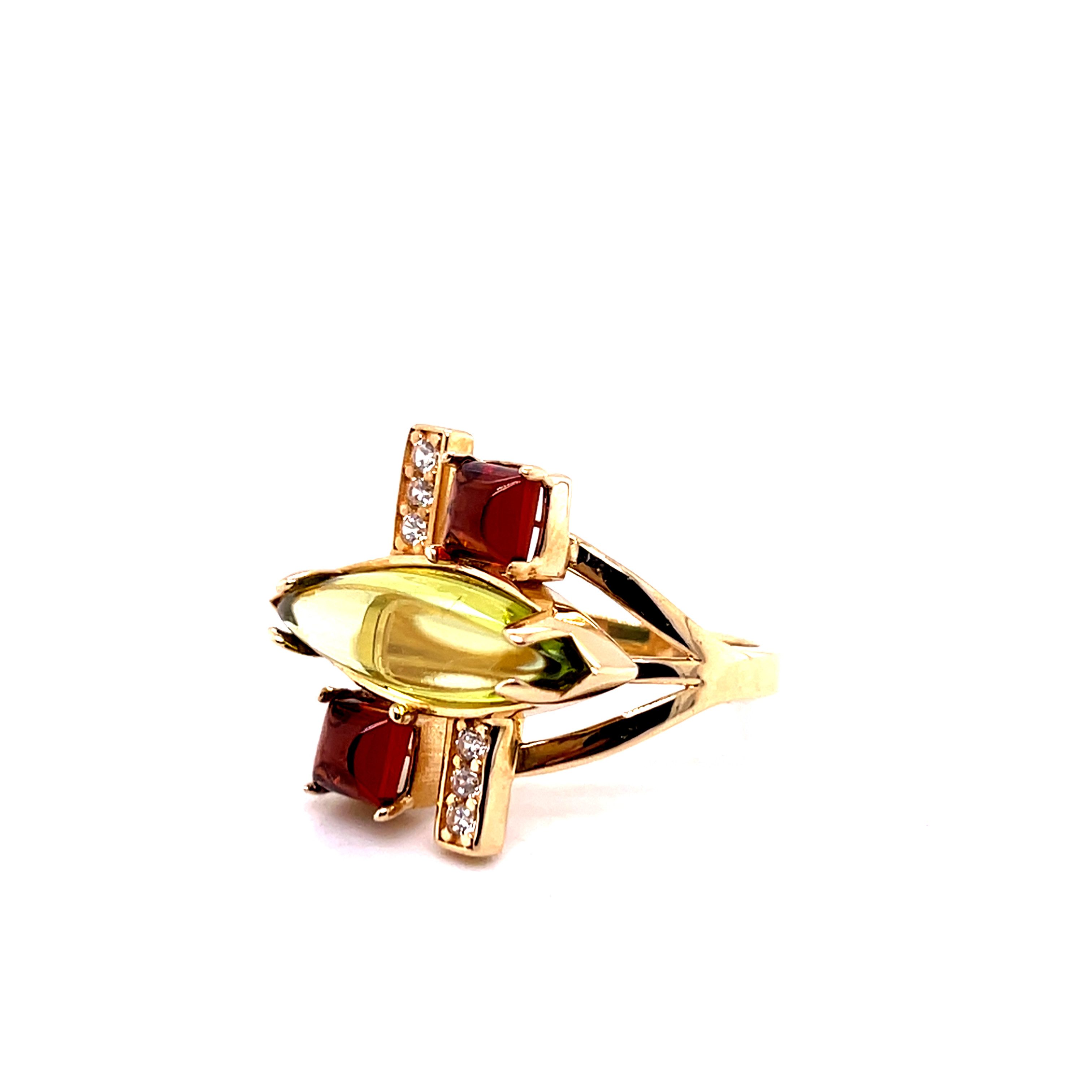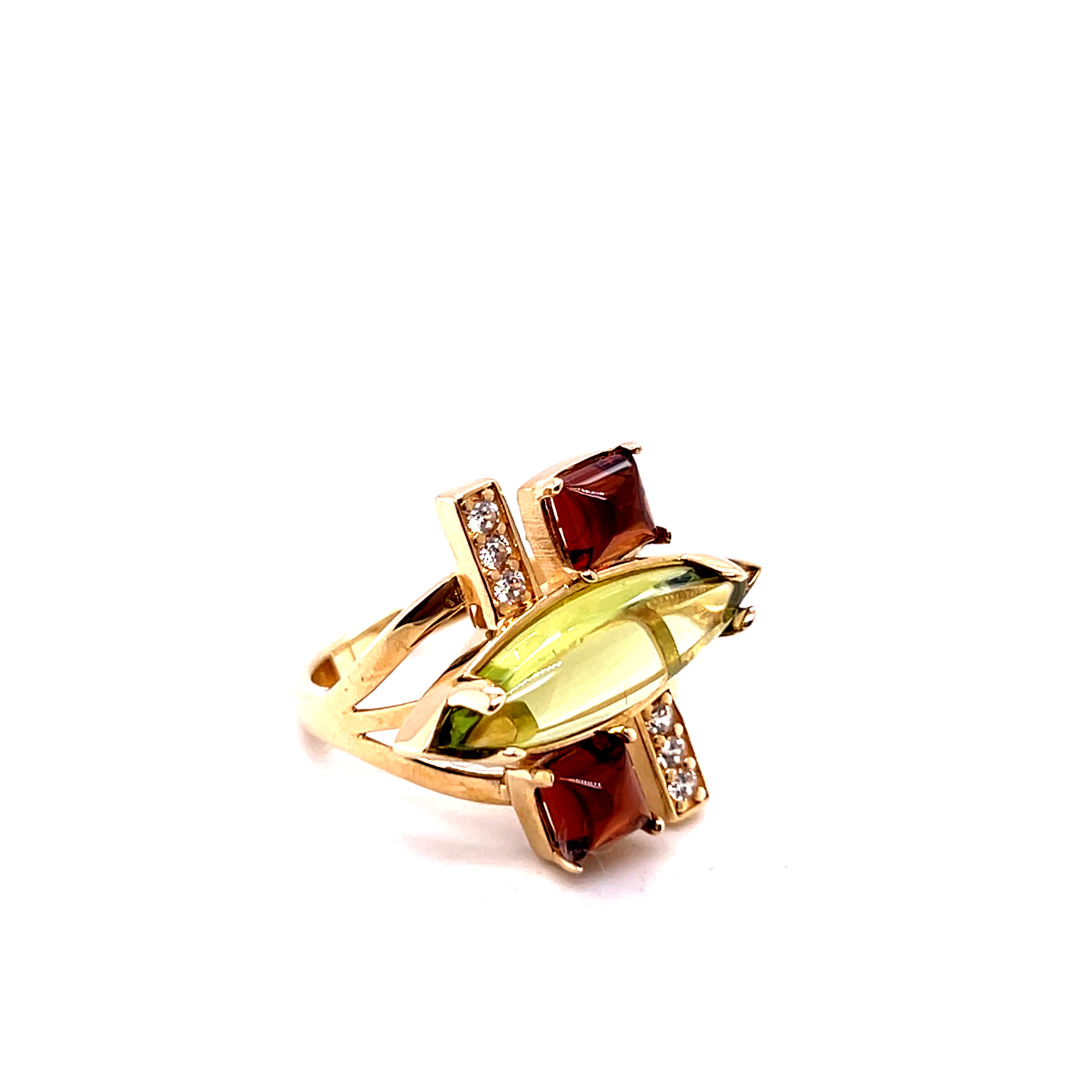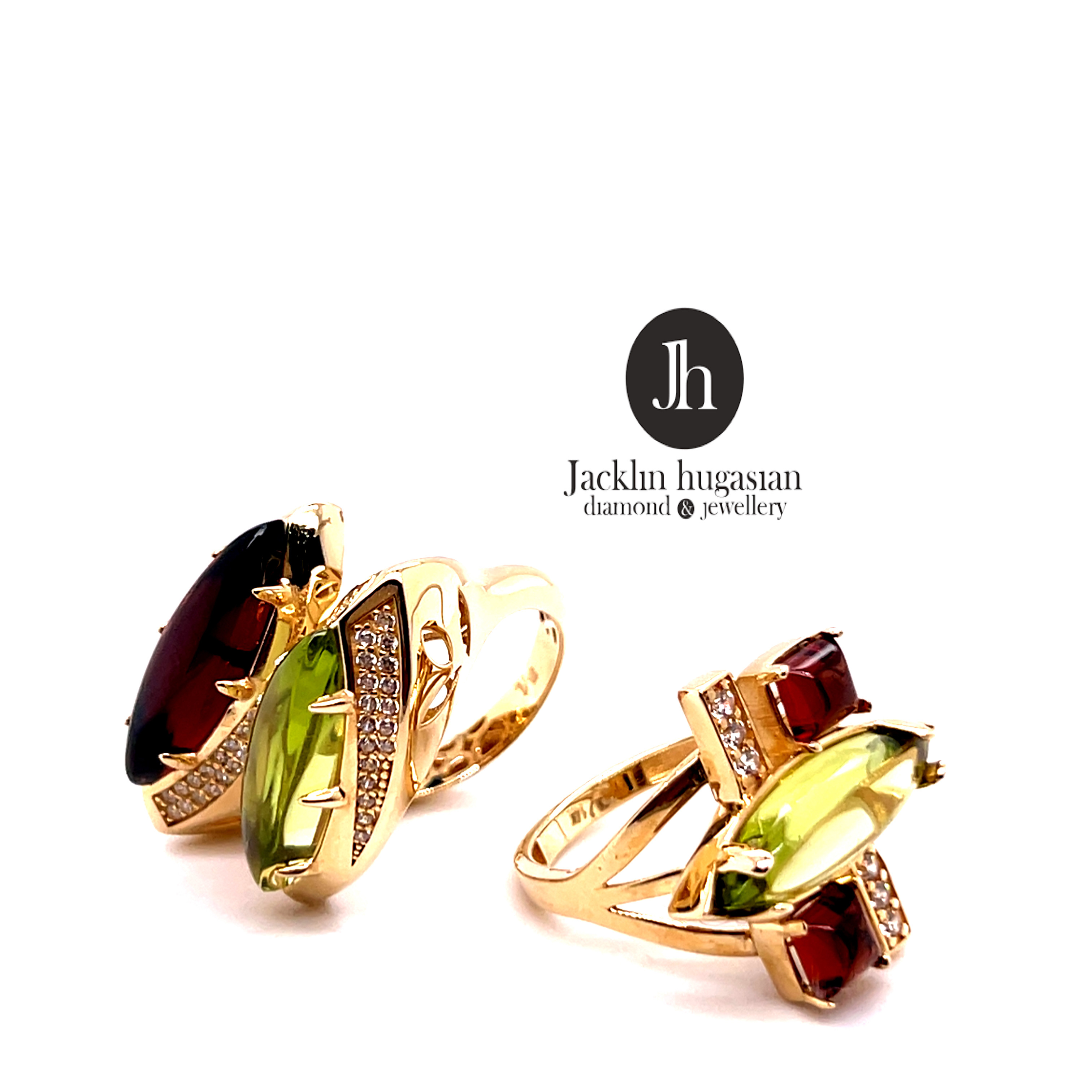 Пръстен от "Jacklin hugasian" в жълто злато с перидот, опушен топаз и циркони.