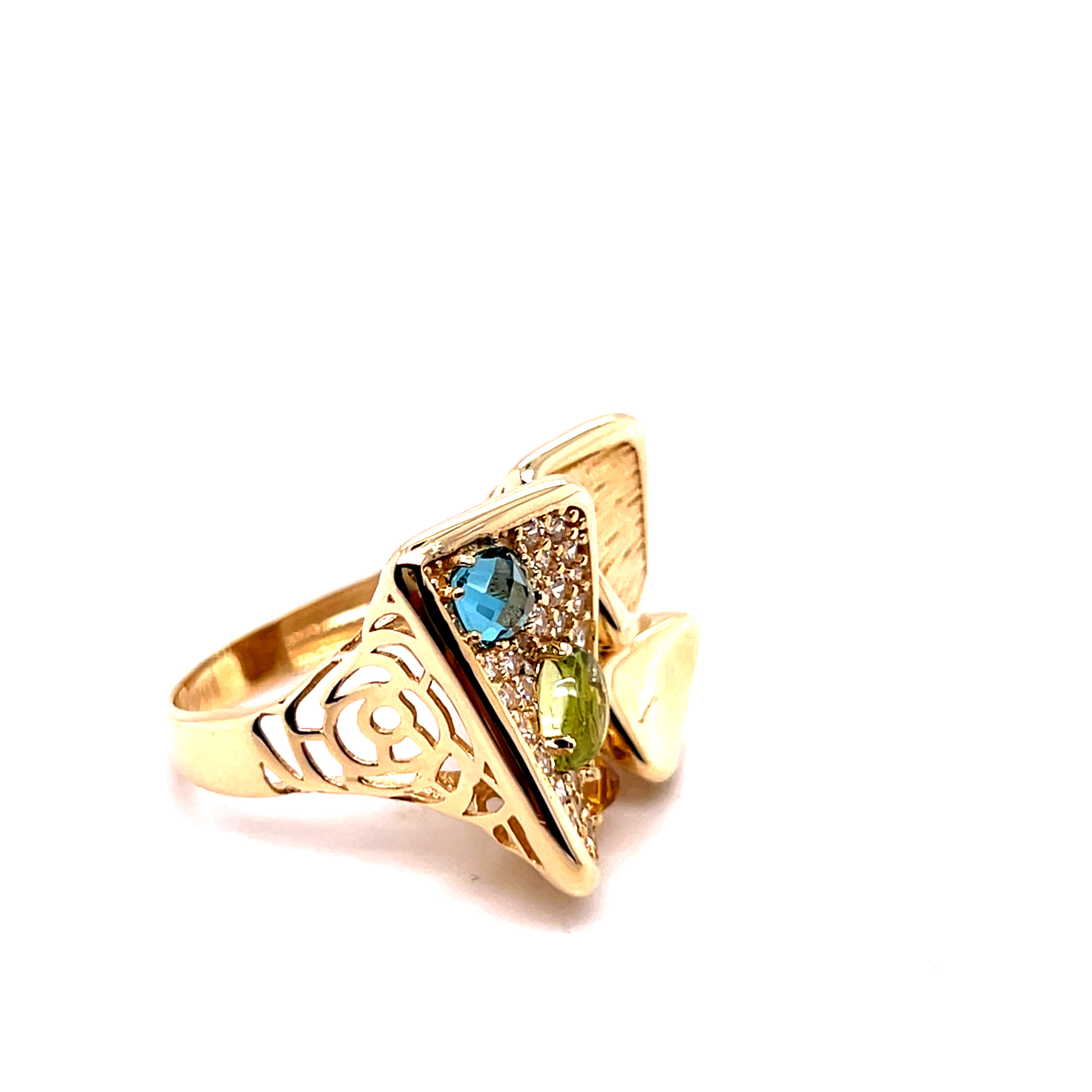 Пръстен от "Jacklin hugasian" в жълто злато с перидот, златист и син топаз, циркони.