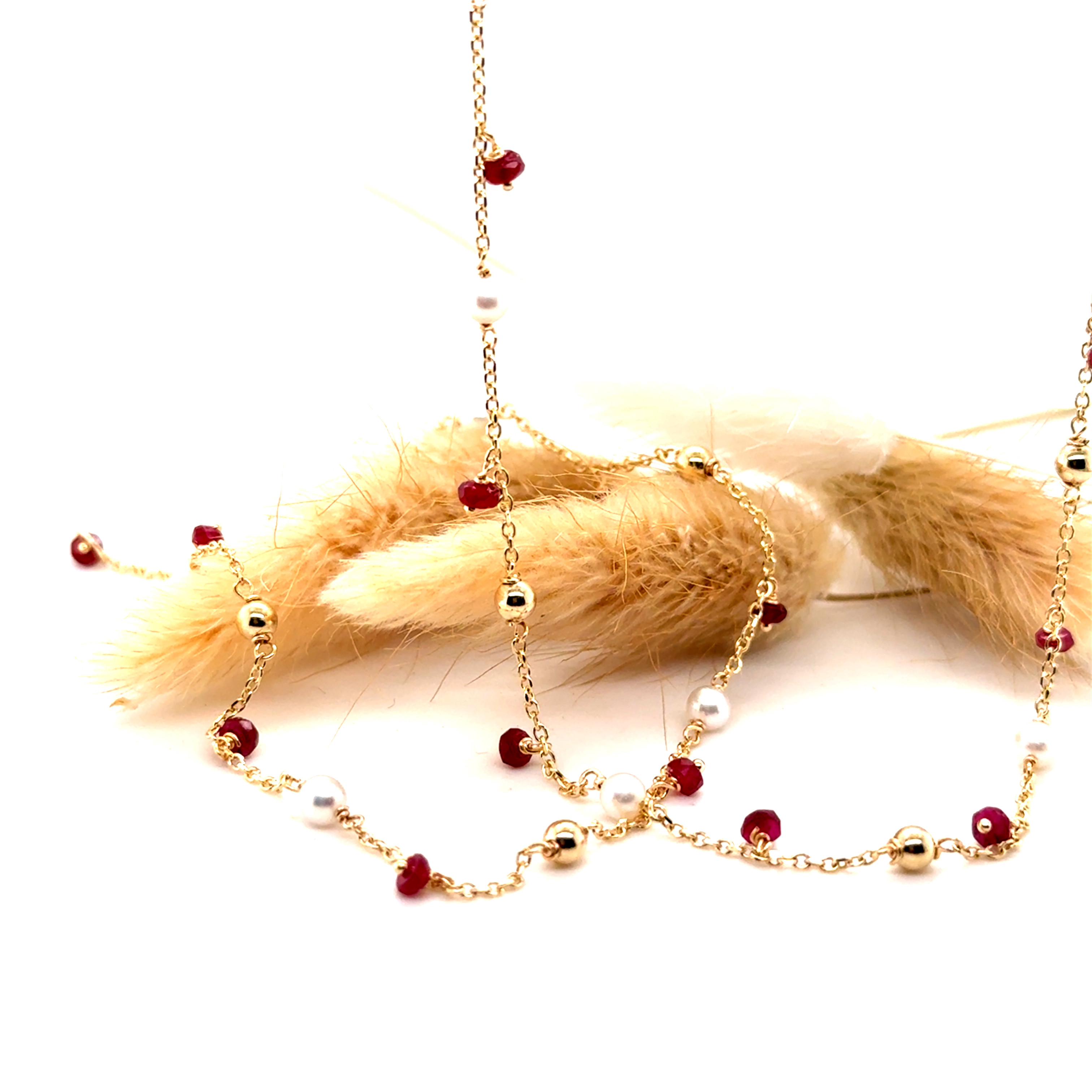 Комплект колие и гривна от “Jacklin hugasian” в жълто злато с естествени перли и рубин