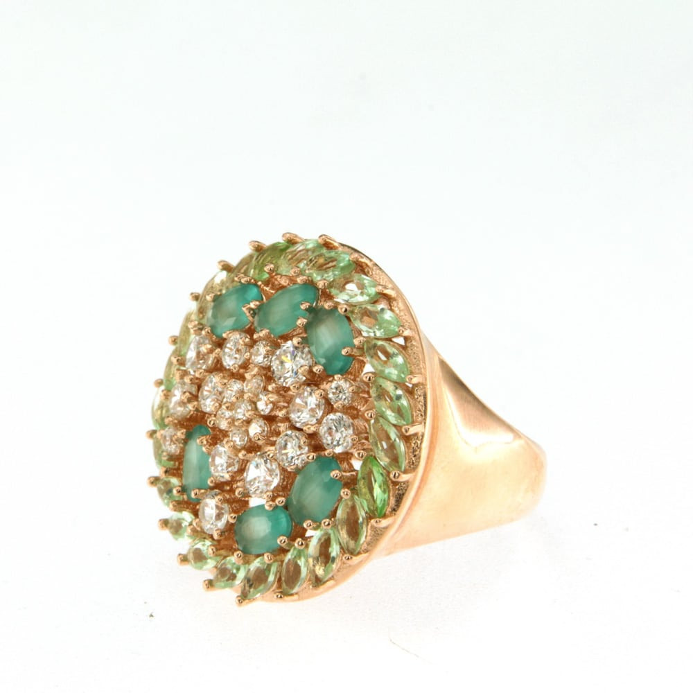 Пръстен от " Jacklin hugasian " розово сребро с цирконий, перидот и зелен нефрит.