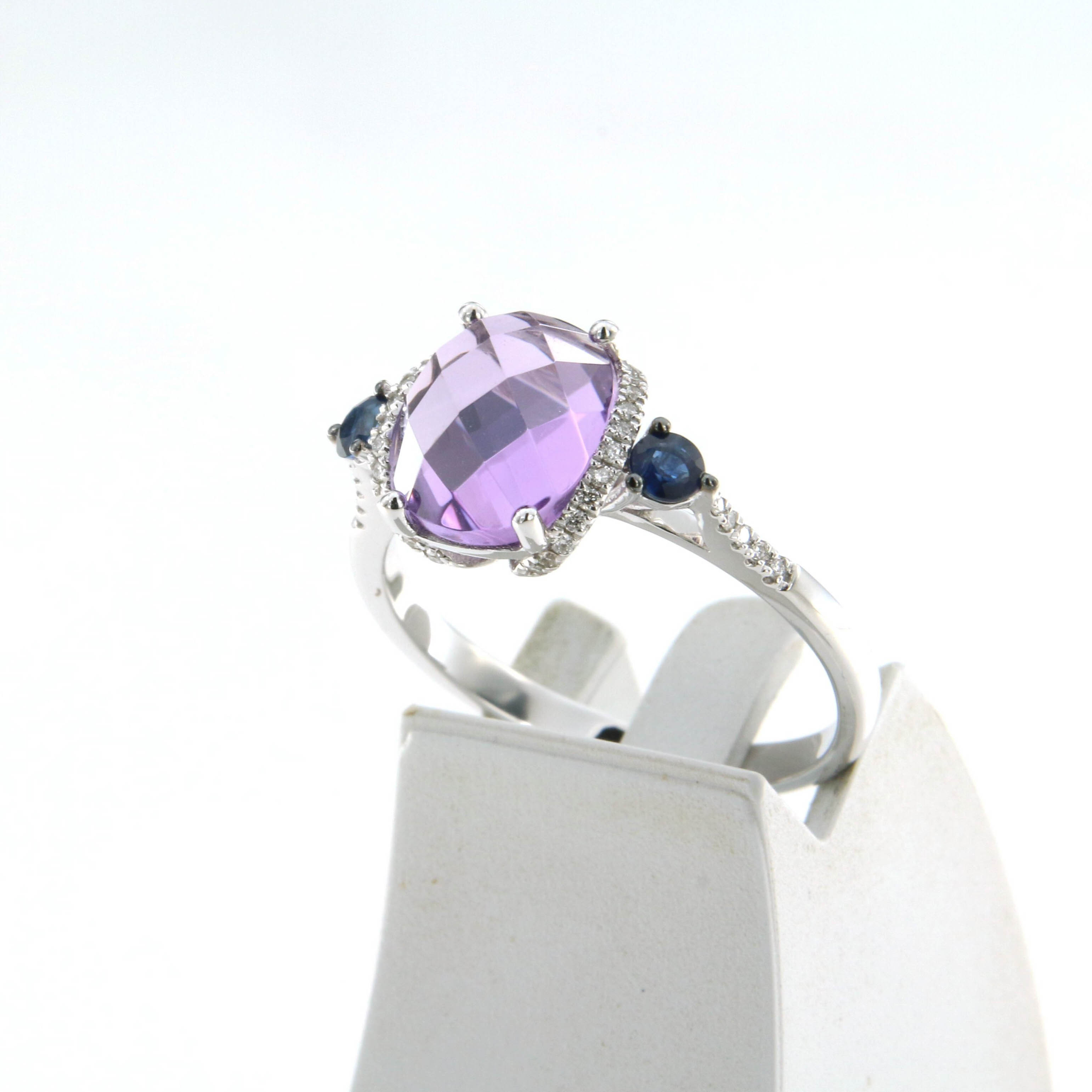 Пръстен от "Jacklin hugasian" в бяло злато с диаманти, естествен сапфир и лилав аметист.