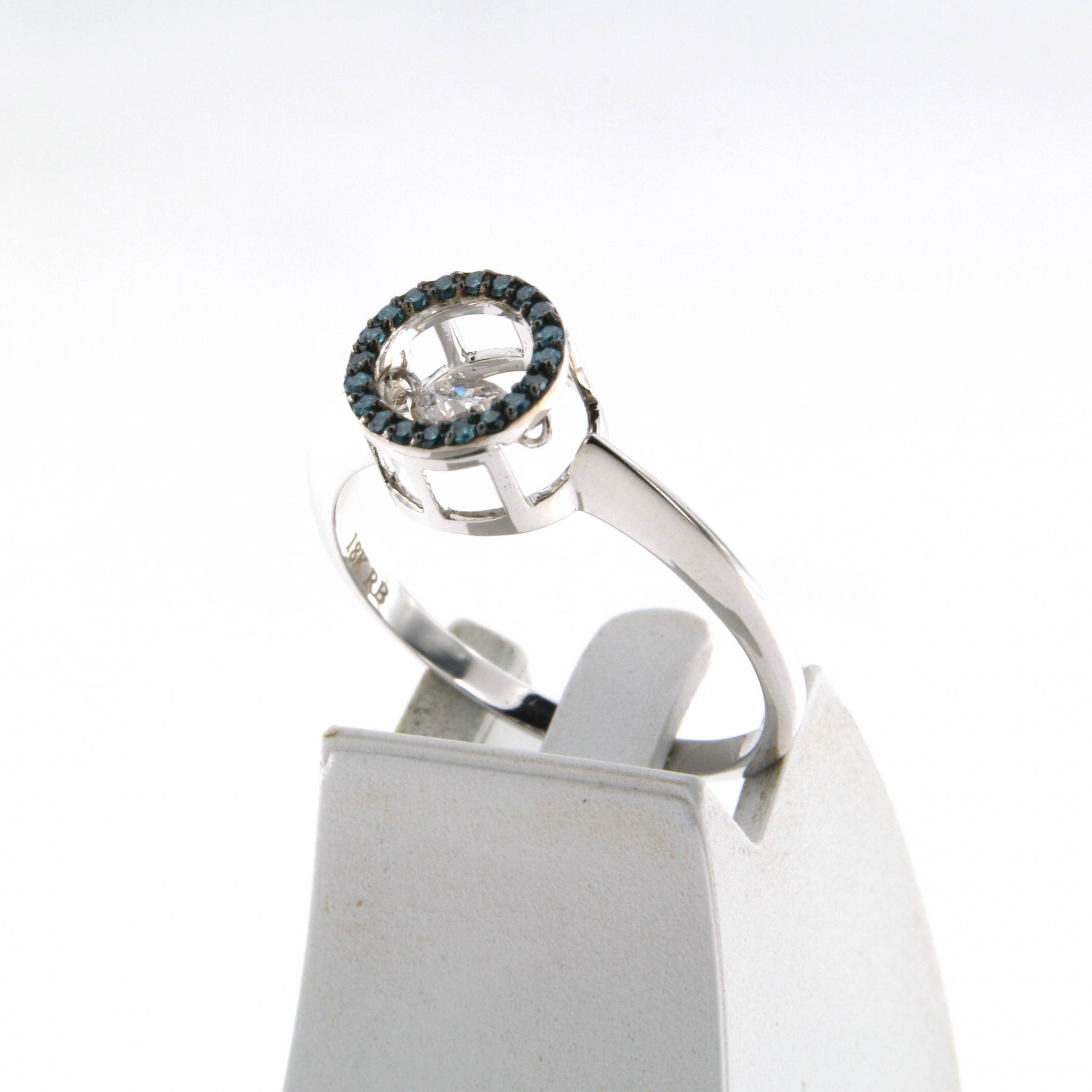 Пръстен от "Jacklin hugasian" в бяло злато с бял диамант и малки сини диаманти.