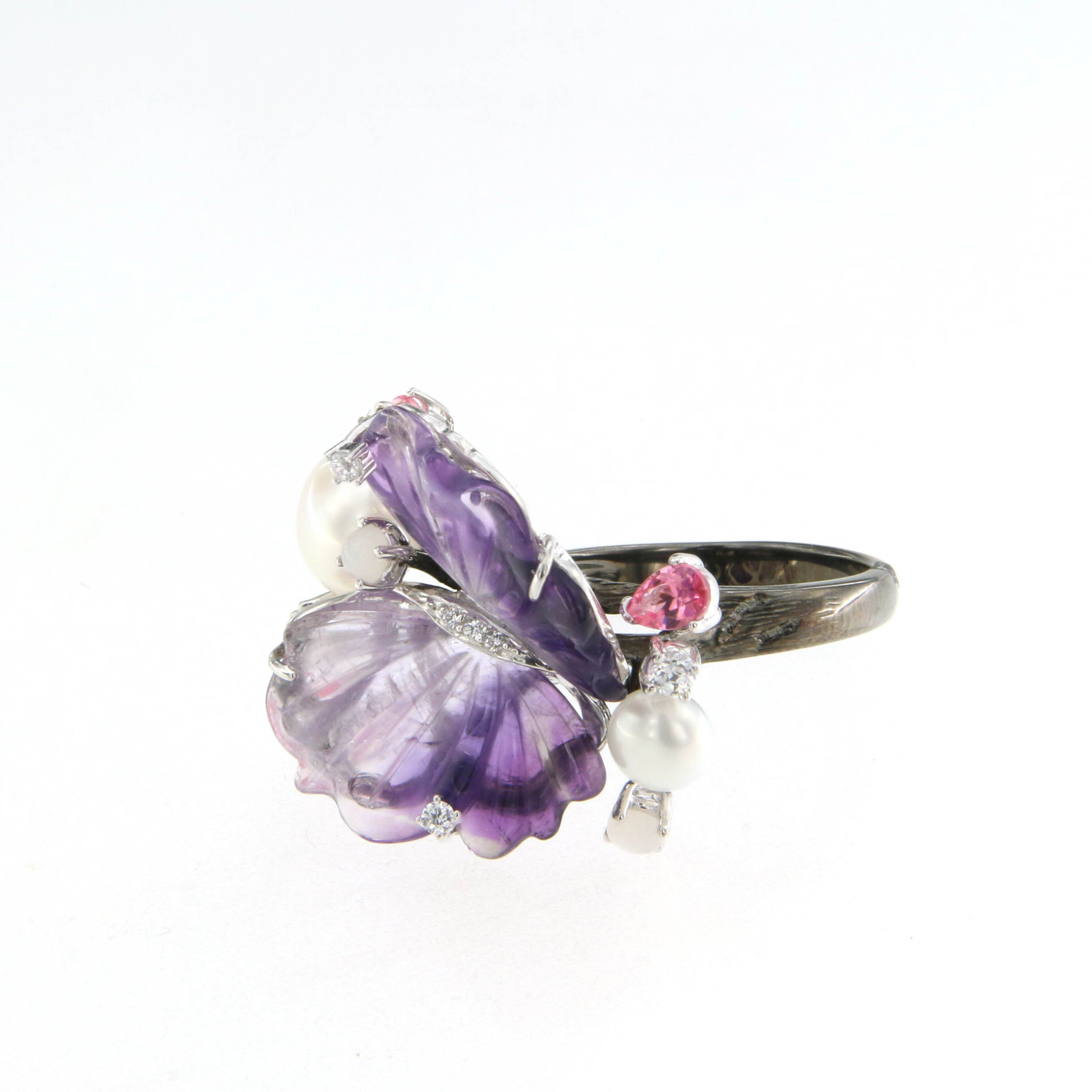 Пръстен от ”Jacklin hugasian” в оксидирано сребро с аметист, естествена перла, ахат, турмалин, розов кварц и цирконии.