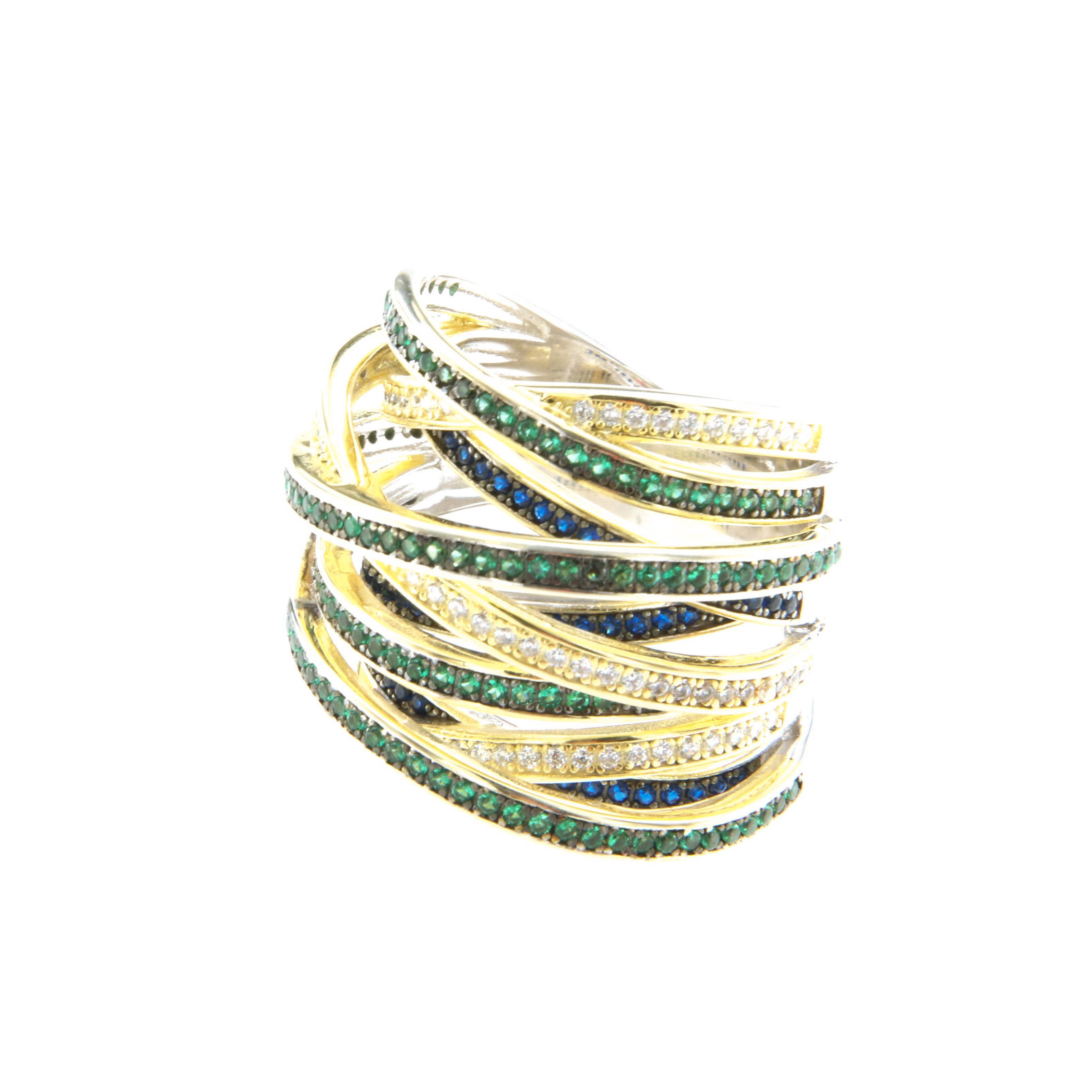 Пръстен от “Jacklin hugasian” в бяло сребро с жълта позлата и цирконии,изумруд и сапфир.