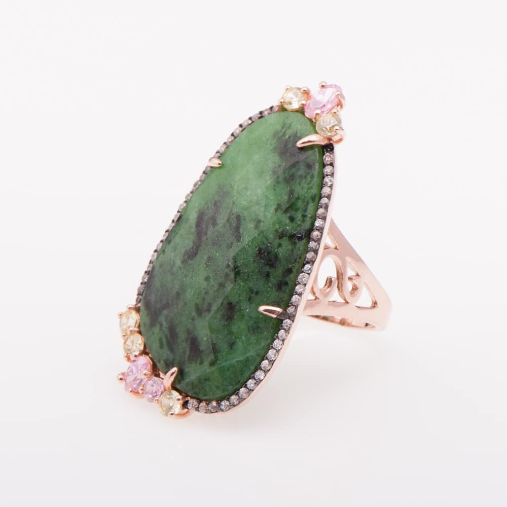Пръстен от "Jacklin hugasian" в розово сребро с цирконии, зелен хематит, цитрин и розов кварц.