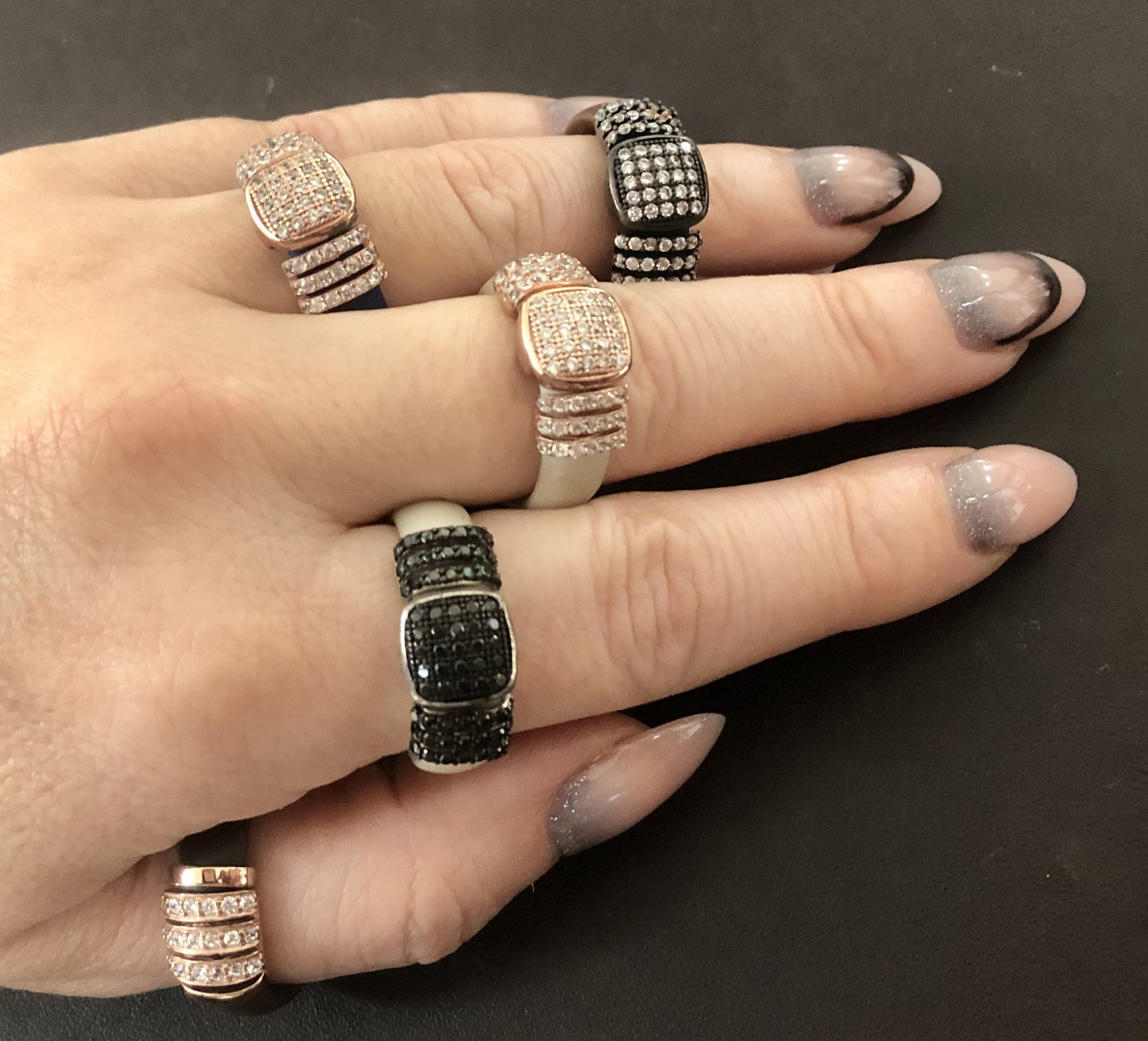 Пръстен от "Jacklin hugasian" в розово сребро с цирконии и цветен силикон.
