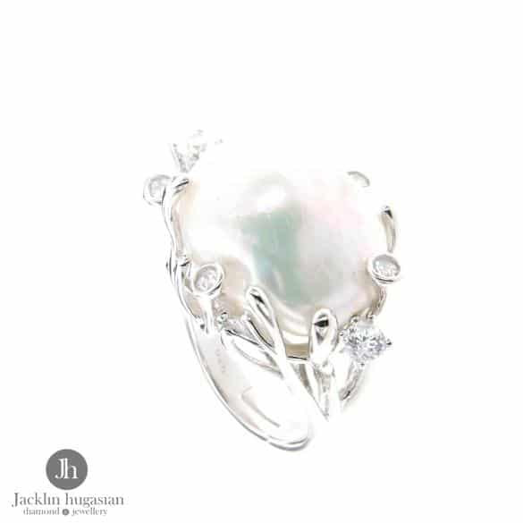 Пръстен от "Jacklin hugasian" в сребро с култивирана бяла перла и цирконии.