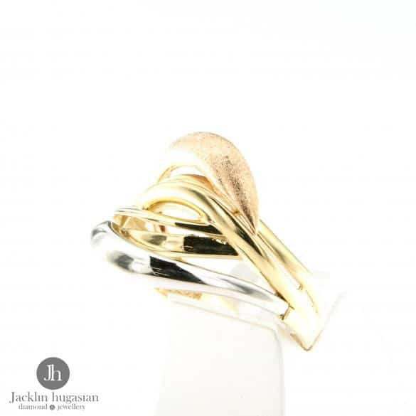 Пръстен от "Jacklin hugasian" в жълто, бяло и розово злато мат и гланц.