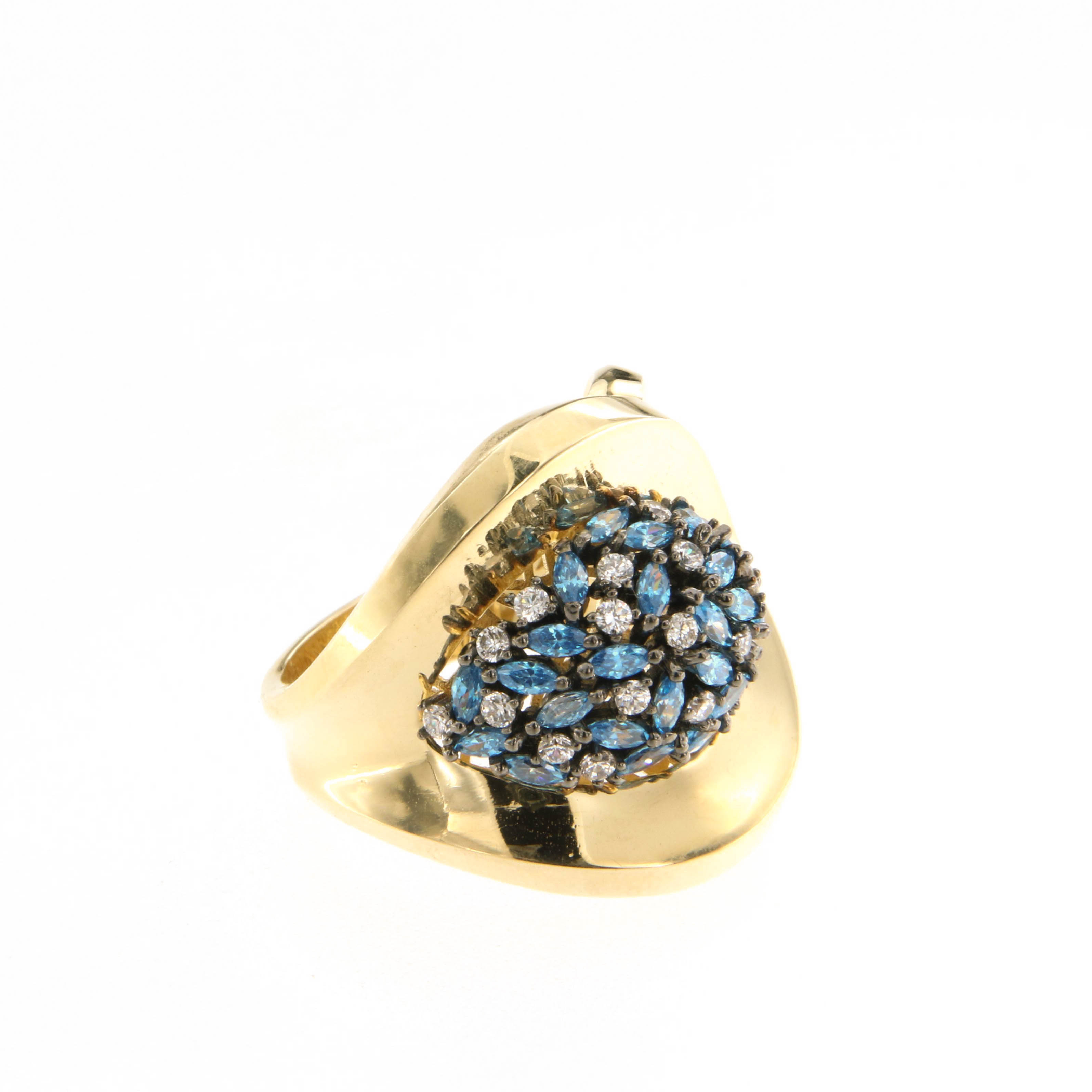 Пръстен от "Jacklin hugasian" в жълто оксидирано злато гланц с цирконии и син топаз.