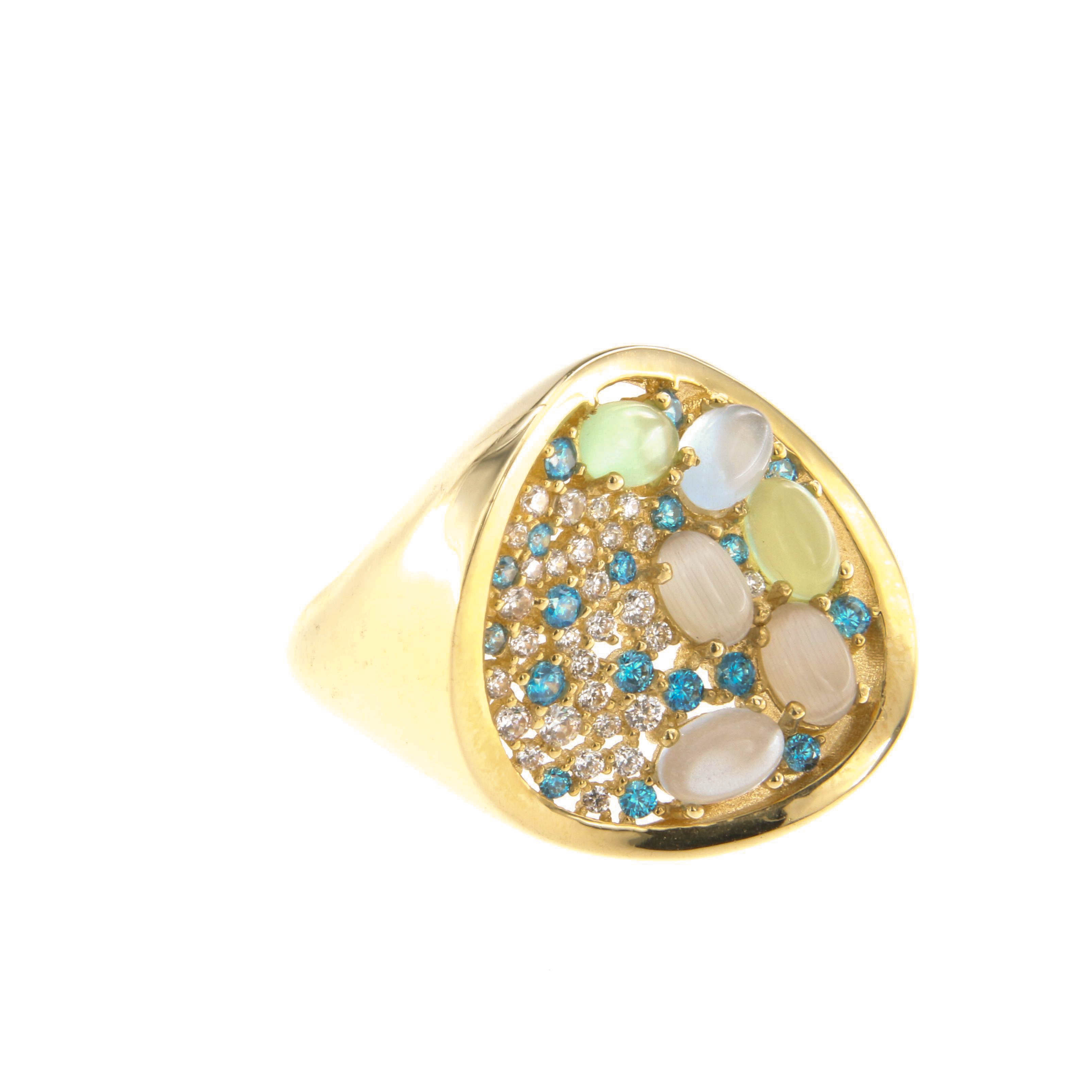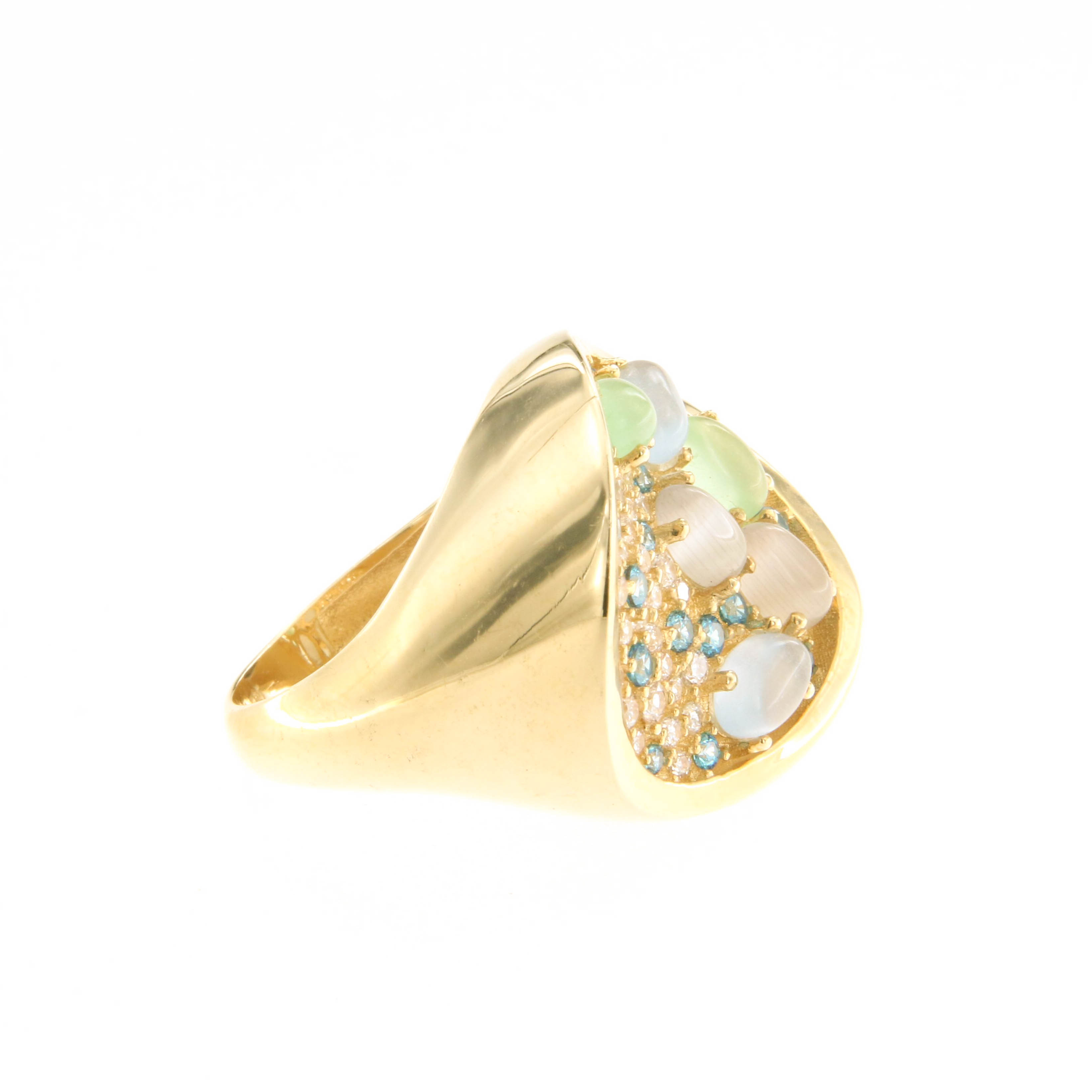 Пръстен от “Jacklin hugasian” в жълто злато с цирконии, син топаз и котешко око.