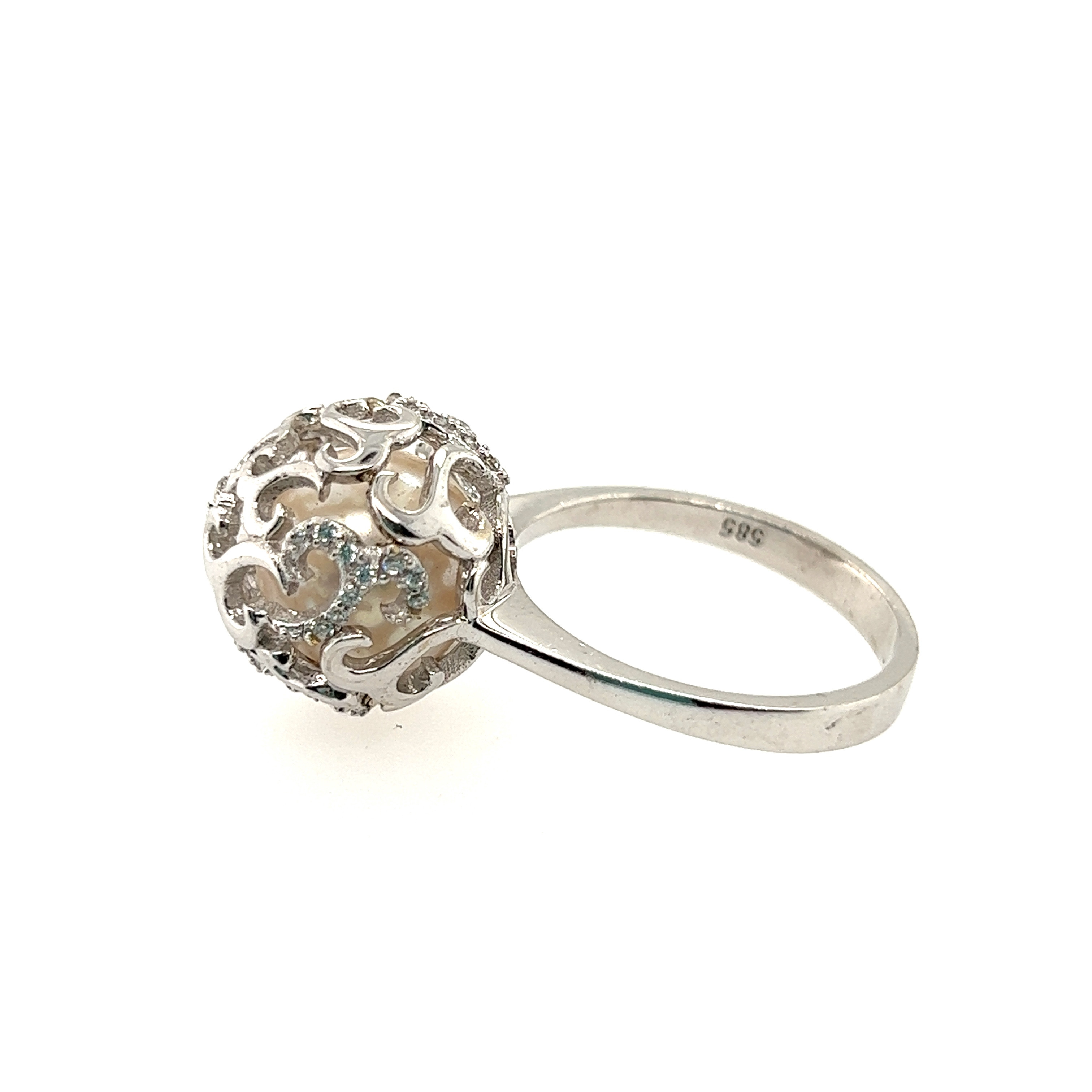 Пръстен от "Jacklin hugasian" в бяло злато с перла и цирконии.