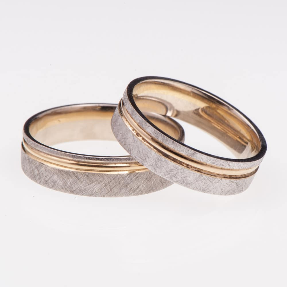 Венчални халки модел "ГРАФИТИ " от "Jacklin hugasian" в бяло и жълто злато сатeниран мат. Ръчна  изработка.