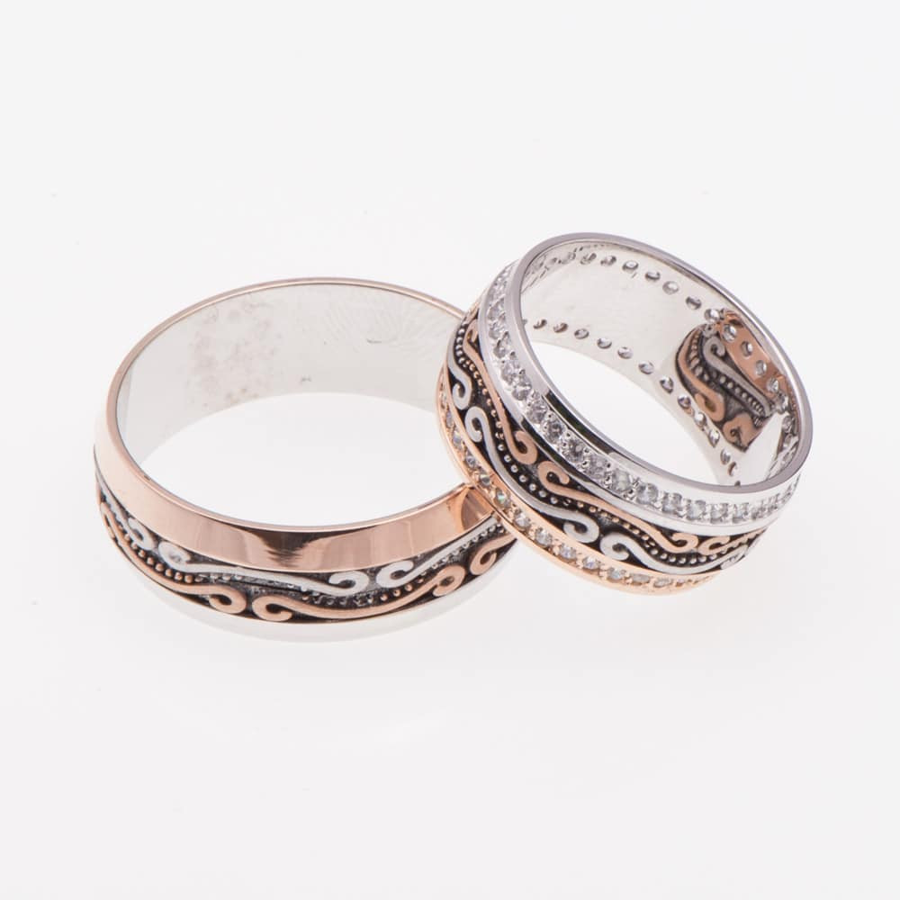 Венчални халки от "Jacklin hugasian" бяло и розово злато с цирконии, мат и гланц. Фабрична изработка.