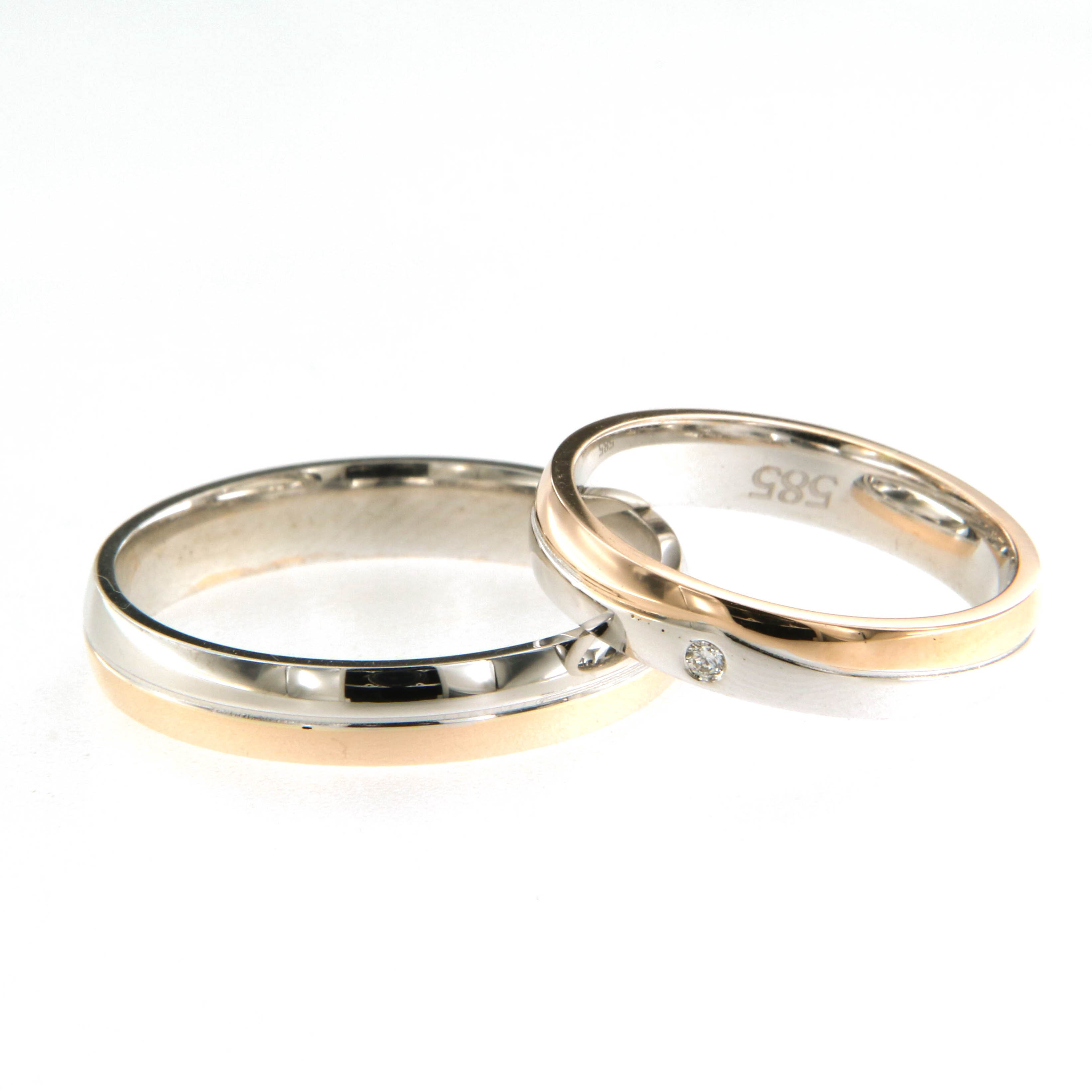 Венчални халки от "Jacklin hugasian " бяло злато и розово гланц с диаманти. 14 К 585 Широчина: 4 мм. Размери: N52 и N60 Грам: 7,61 гр. Характеристики Dia: VS-G/ 0.03ct. Ръчна изработка(15раб.дни)