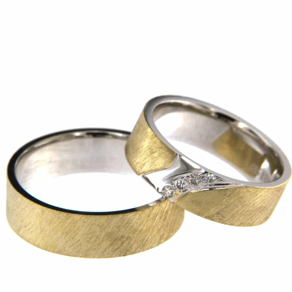 Венчални халки от " Jacklin hugasian " в бяло и жълто злато, мат и гланц с диаманти.Фабрична изработка.