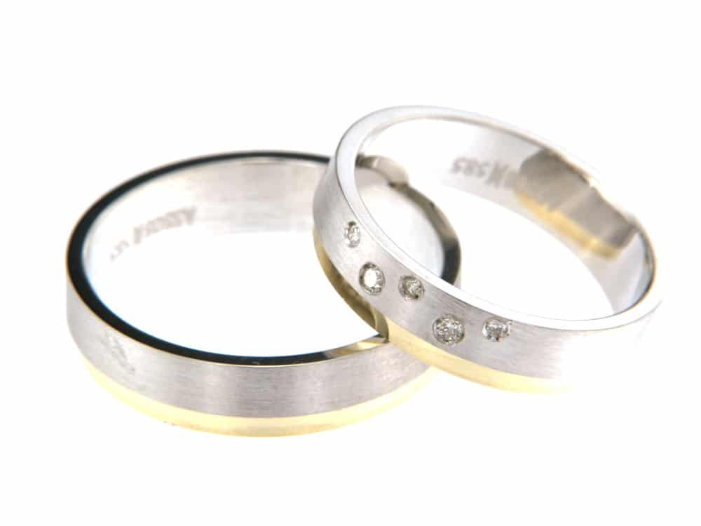 Венчални халки от " Jacklin hugasian " в бяло и жълто злато, мат и гланц с диаманти.Фабрична изработка.