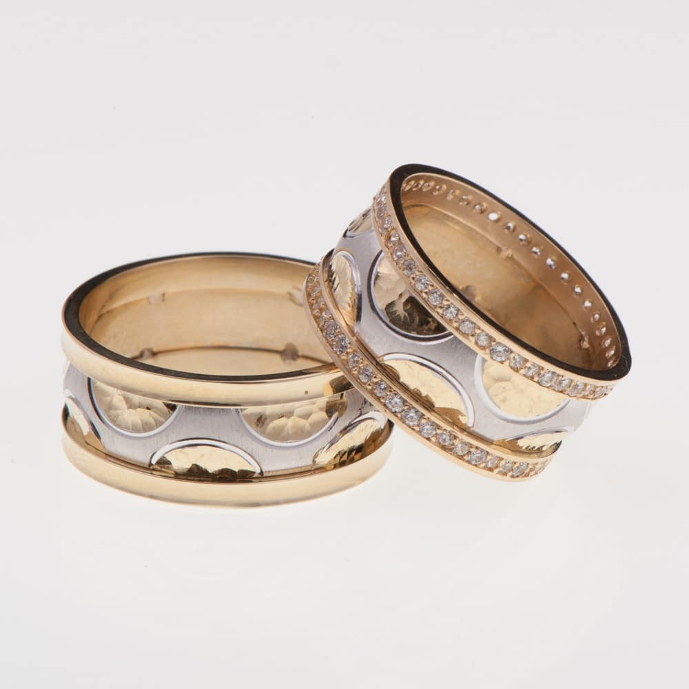 Венчални халки от "Jacklin hugasian" в бяло и жълто злато с цирконии. Фабрична изработка. Колекция " ASSOS ".