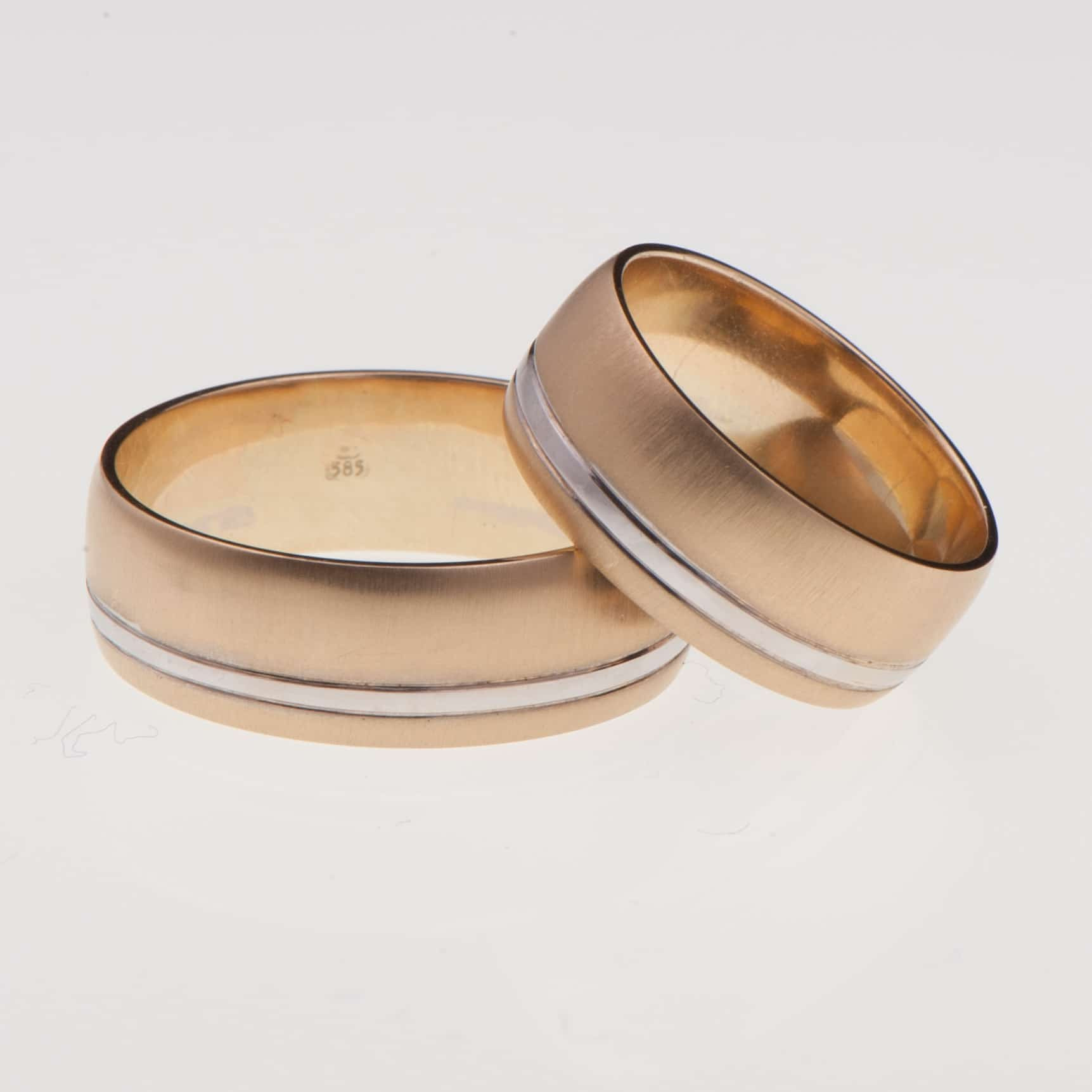 Венчални халки от" Jacklin hugasian " в бяло злато гланц и жълто злато мат.Ръчна изработка.Широчина : 7.00 мм. 14 К 585 Рамер : N52 и N65 Грам : 12.20 гр.