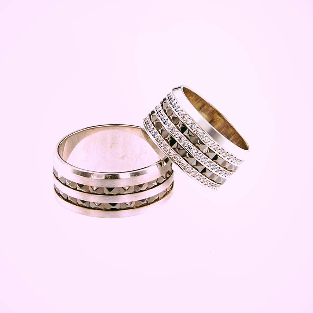 Венчални халки от "Jacklin hugasian" в бяло злато мат и гланц с циркони и черен родии.