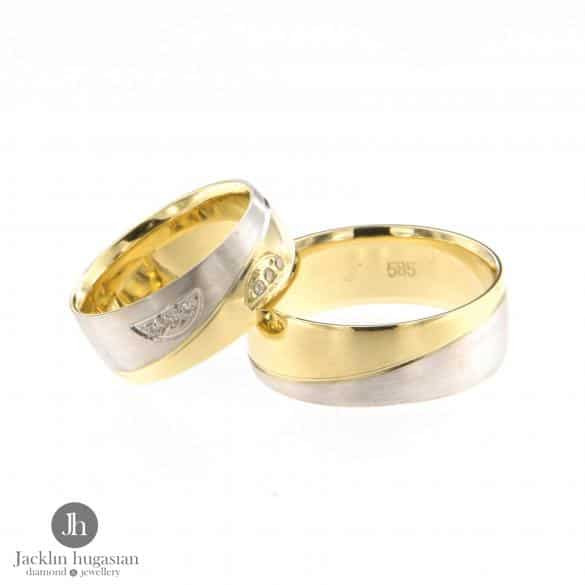 Венчални халки от "Jacklin hugasian" в жълто и бяло злато мат и гланц с цирконии.