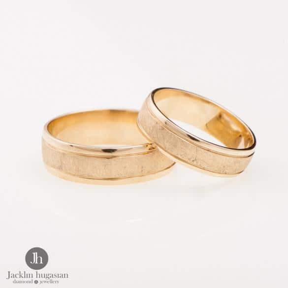 Венчални халки от " Jacklin hugasian " в жълто злато, сaтениран мат и гланц.Ръчна изработка. 14 К 585 Широчина : 5.00 мм Размери : N53 и N62 Грам : 8.82 гр.