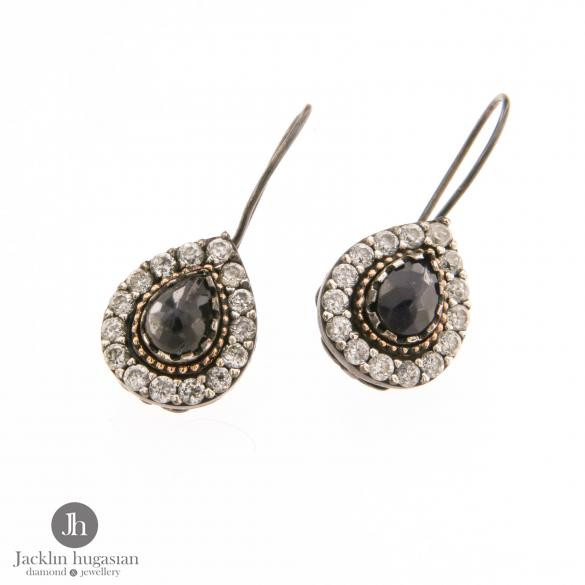 Висящи обеци от "Jacklin hugasian" в оксидирано сребро с жълта позлата, цирконии и камък "Лапис лазули". Дължина обеци 3.1 см., широчина 1.4 см. Колекция " SULTAN ".