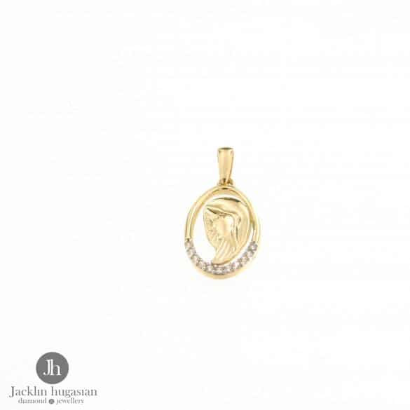 Висулка " Богородица " от " Jacklin hugasian " в жълто злато,гланц с цирконий.Дължина висулка 1.6 см. , широчина 0.9 см.