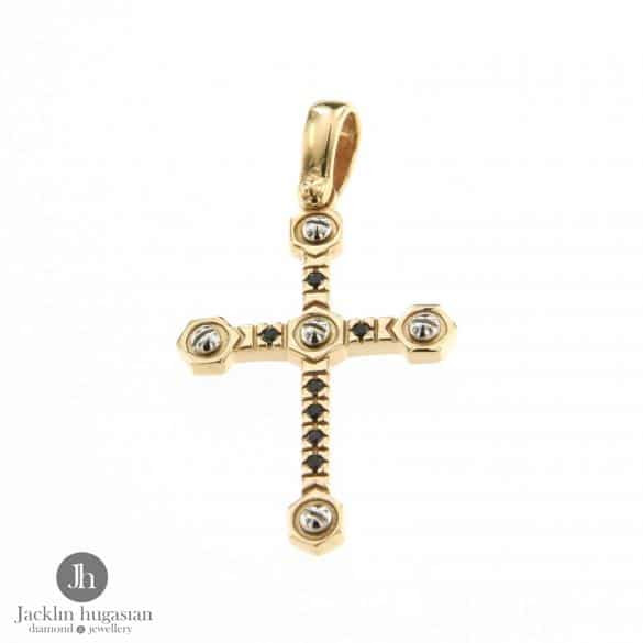 Висулка "Кръст" от "Jacklin hugasian" в жълто и бяло злато гланц с черни оникси