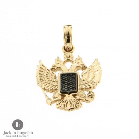 Висулка от " Jacklin hugasian " в жълто злато,гланц и черни оникси.Дължина висулка 2.5 см. , широчина 1.9 см.Произход Италия.