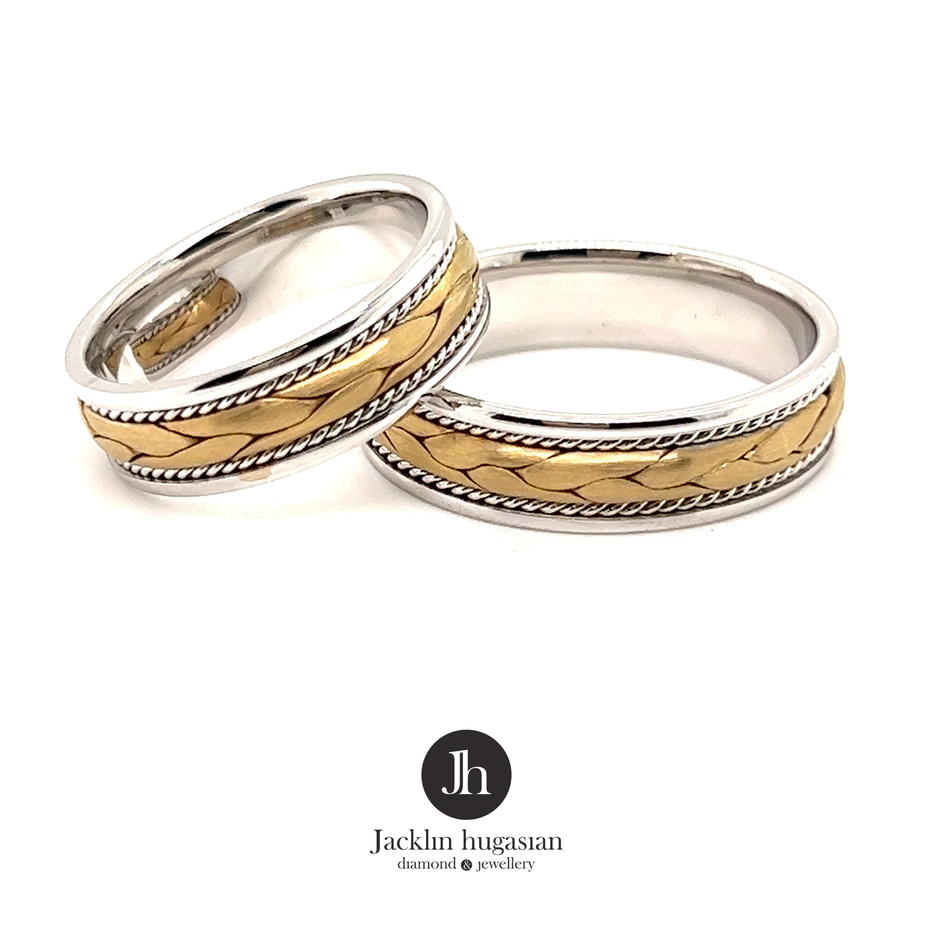 Венчални халки от "Jacklin hugasian" в жълто и бяло злато мат и гланц с цирконии.