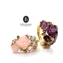 Пръстен от “Jacklin hugasian” в сребро с позлата, розов кварц и циркони / аметист и опушен топаз