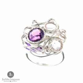 Пръстен от "Jacklin " в бяло злато гланц с лазерна шлифовка, лилав аметист и бледо розов кварц