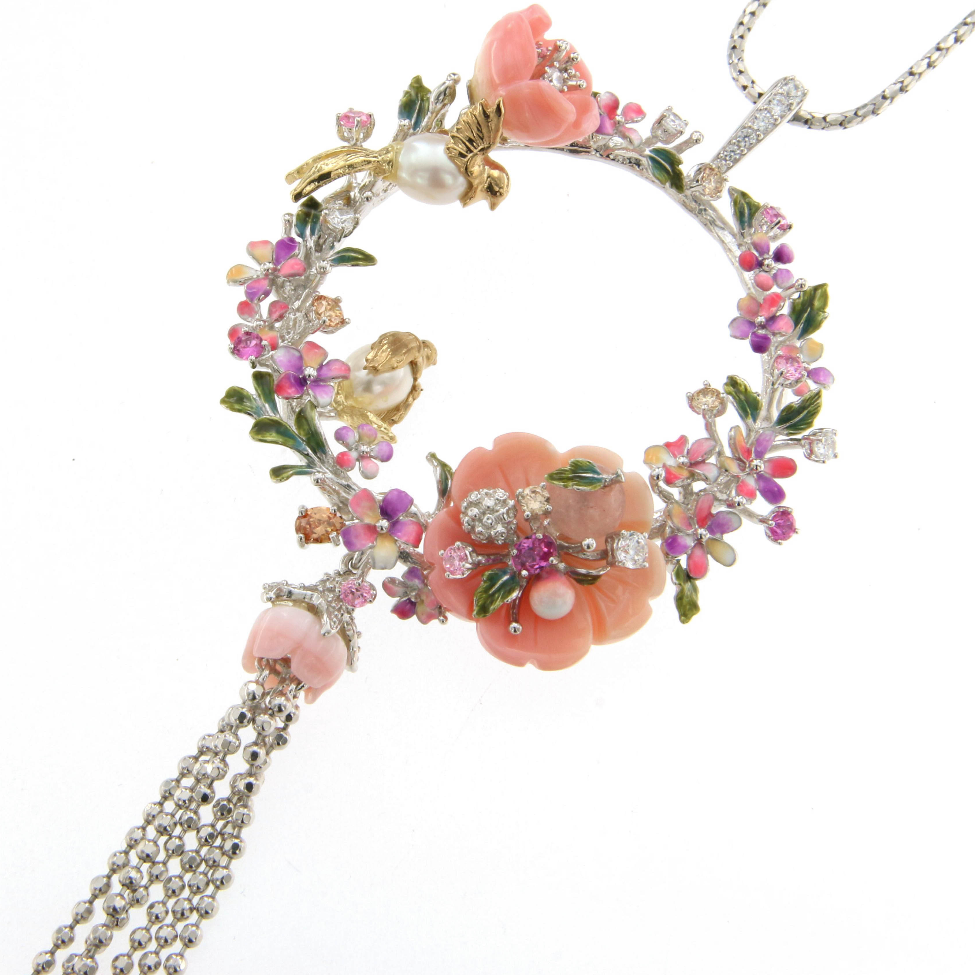 Висулка от ”Jacklin hugasian” в сребро и сребро с позлата, корал, цветен емайл, розов кварц, перли и циркони.
