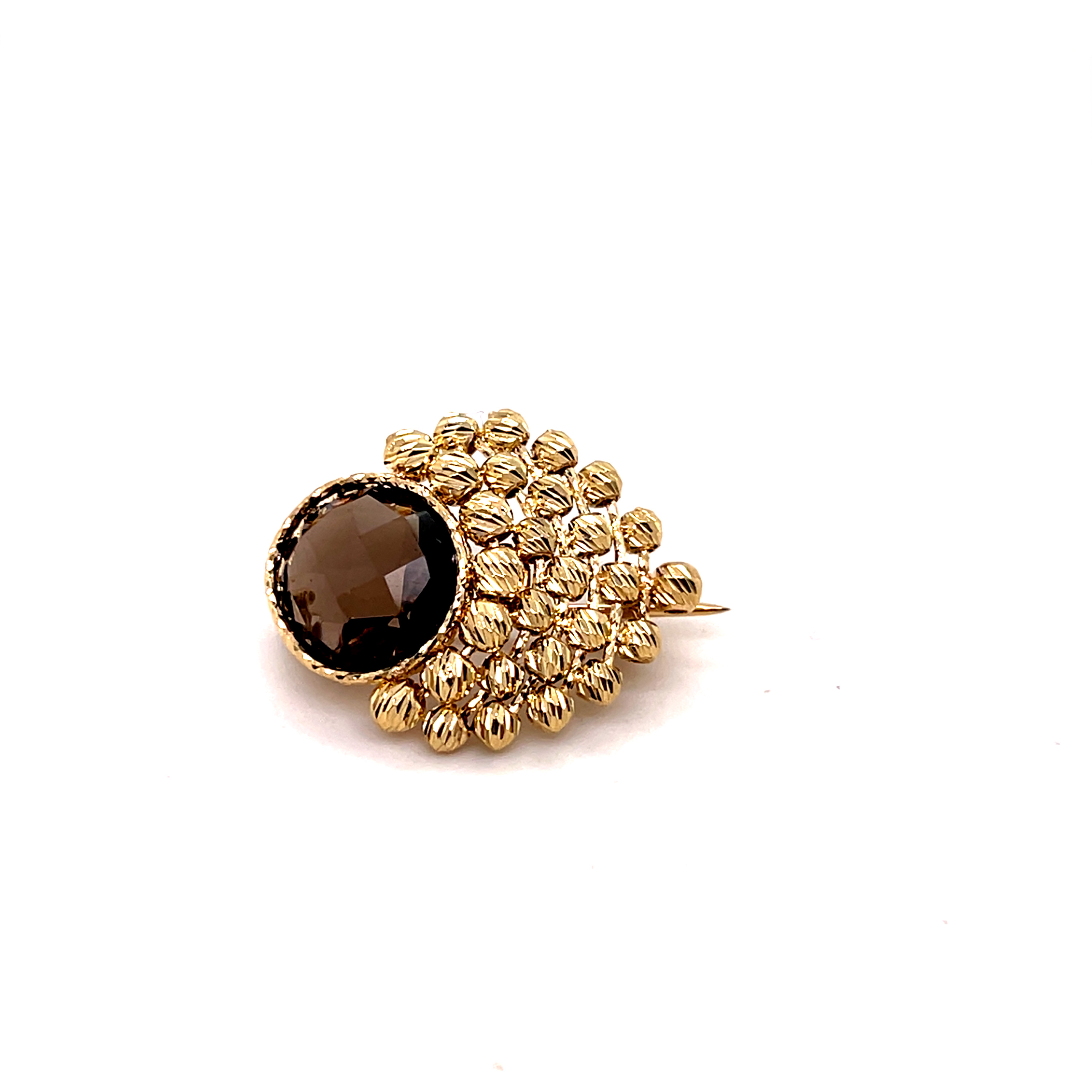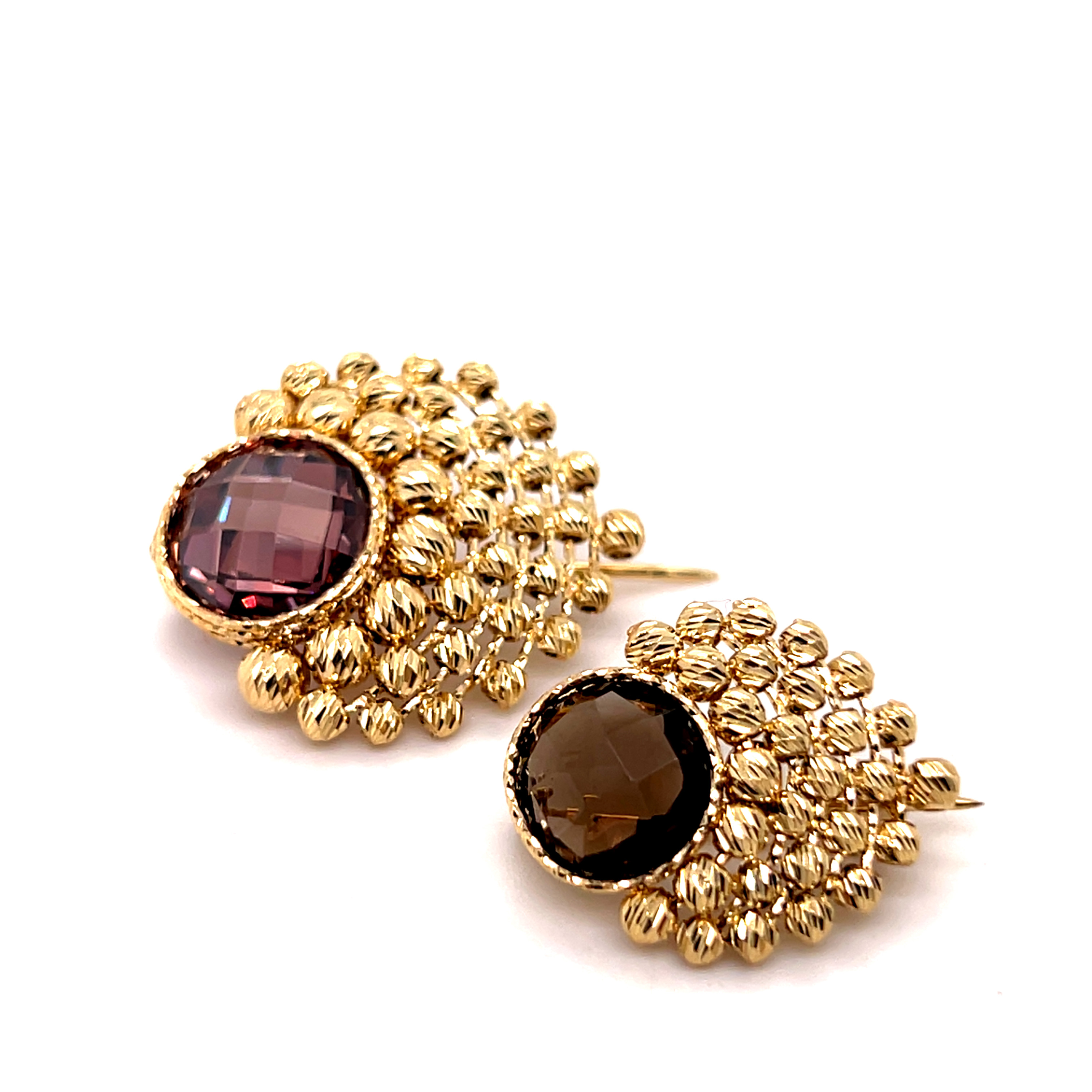 Брошка от ”Jacklin hugasian” в жълто злато с опушен топаз и аметист