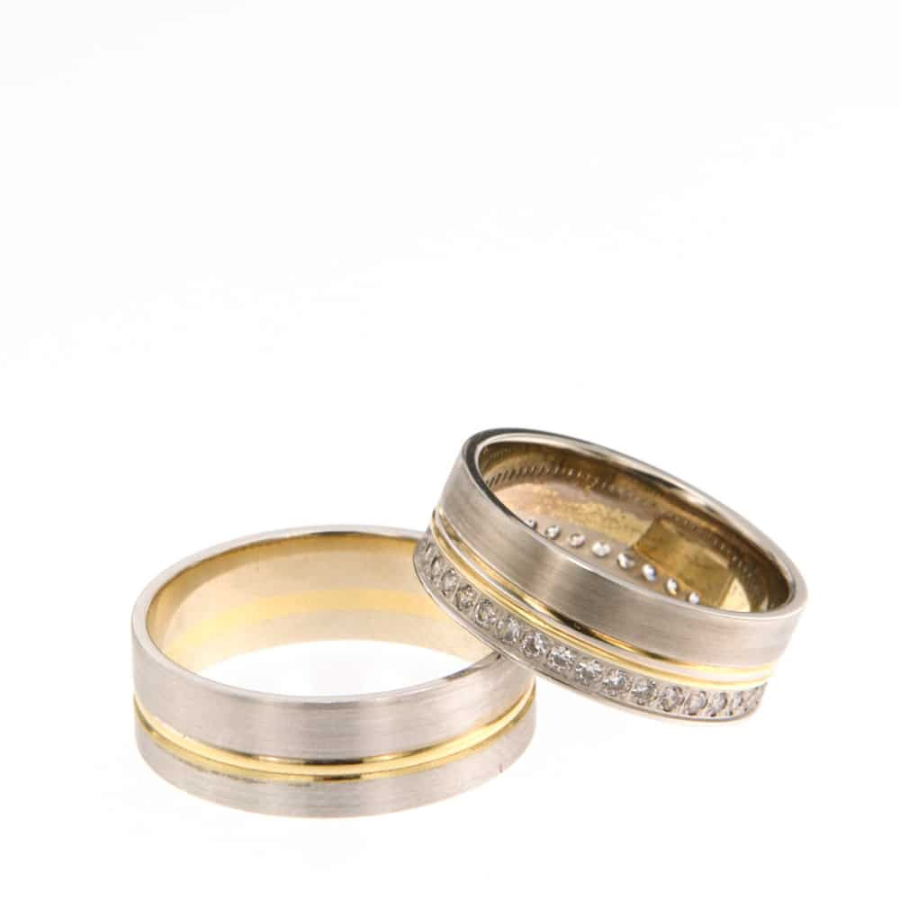 Брачни халки от " Jacklin hugasian " в бяло и жълто злато с цирконий, мат и гланц.
