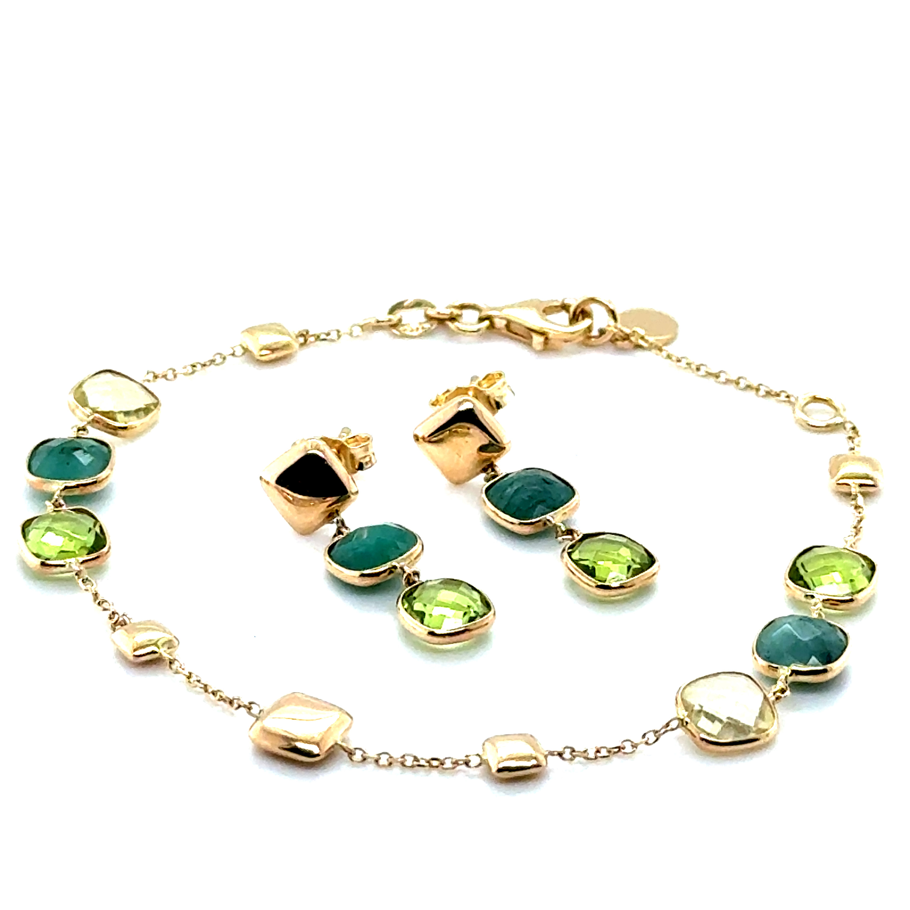 Комплект обеци и гривна от “Jacklin hugasian” в жълто злато с перидот, цитрин и зелен хематит