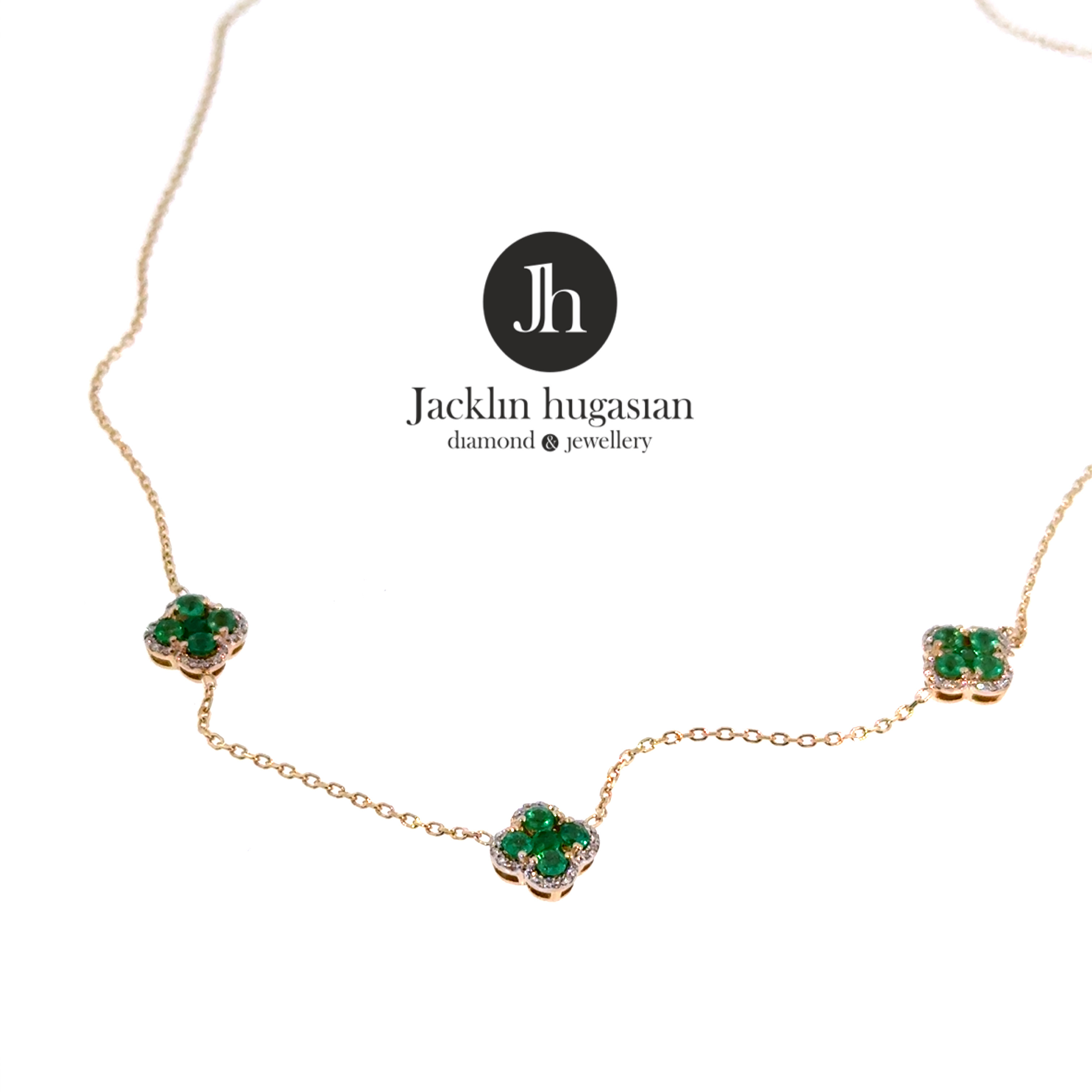 Колие от “Jacklin hugasian” в жълто злато с диаманти и изумруди.